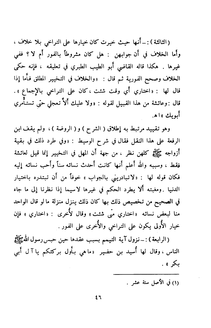 وَهُوَتَقْيِيْدٌ مُرْتَبِطٌ بِهِ إِطْلَاقُ "الشَّرْحِ" وَ "الرَّوْضَةِ" وَلَمْ يَقِفِ ابْنُ الرِّفْعَةِ (3) عَلَى هَذَا النَّقْلِ فَقَالَ فِي شَرْحِ الْوَسِيْطِ: وَفِي طَرْدِ ذَلِكَ فِي بَقِيَّةِ أَْزْوَاجِهِ صَلَّى اللهُ عَلَيْهِ وَسَلَّمَ كُلِّهِنَّ نَظَرٌ مِنْ جِهَةِ أَنَّ الْمَهْلَ فِي التَّخْيِيْر إِنَّمَا قِيْلَ لعَائِشَةَ فَقَطْ. وَسَبَبُهُ- وَاللهُ أَعْلَمُ- أَنَّهَا كَانَتْ أَحَدثَ نِسَائِهِ سِنًّا وَأَحَبَّ نِسَائِهِ إِلَيْهِ فَكَانَ قَوْلهُ لَهَا: لَا تُبَادِرِيْنِيْ بِالْجَوَابِ" (4) خَوْفًا مِنْ أَنْ تَبْتَدِرَهُ بِاخْتِيَارِ الدُّنْيَا. وَمَغَبَّتُهُ أَلَّا يَطَّرِدَ الْحُكْم فِي غَيْرِهَا لَاسِيِّمَا إِذَا نَظَرْنَا إِلَى مَا جَاءَ فِي الصَّحِيْحِ مِنْ تَخْصِيْصِ ذَلِكَ بِهَا كَانَ ذَلِكَ يَنْزِلُ مَنَزْلَةً مَا قَالَ الوَاحِدُ مِنَّا لِبَعْضِ نِسَائِهِ: اخْتَارِيْ مَتَى شِئْتِ" وَقَالَ لِأُخْرَى: اخْتَارِيْ " فَإِنَّ خِيَارَ الْأُوْلَى يَكُوْنُ عَلَى التَّرَاخِيْ وَالْأُخْرَى عَلَى الْفَوْرِ.