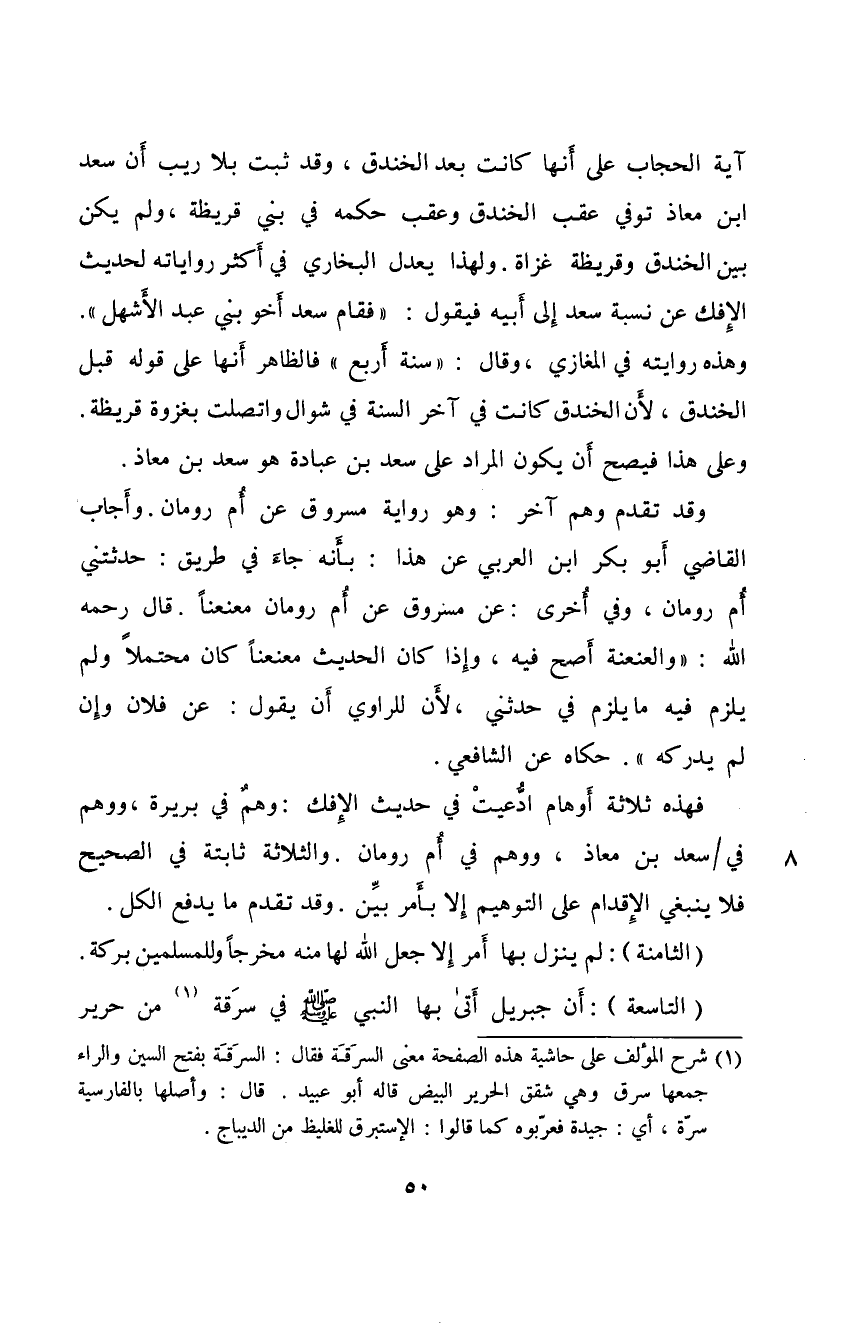 آَيَةِ الْحِجَاب عَلَى أَنَّهَا كَانَتْ بَعْدَ الْخَنْدَقِ. وَقَدْ ثَبَتَ بِلَارَيْبٍ أَنَّ سَعْدَ ابْنَ مُعَاذٍ تُوُفِّيَ عَقِبَ الْخَنْدَقِ؛ وَعَقِبَ حُكْمِهِ فِي بَنِيْ قُرَيْظَةَ. وَلَمْ يَكُن بَيْنَ الْخَنْدَقِ وَقُرَيْظَةَ غَزَاةٌ. وَلِهَذَا يَعْدِلُ الْبُخَارِيُّ فِي أَكْثَرِ رِوَايَاتِهِ لِحَدِيْثِ الْإِفْك عَنْ نِسْبَةِ سَعْدٍ إِلَى أَبِيْهِ فَيَقُوْلُ: فَقَامَ سَعْدٌ أَخُوْ بَنِيْ عَبْدِ الْأَشْهَلِ" وَهَذِهِ رِوَايَتُهُ فِي الْمَغَازِي. وَقَالَ: سَنَةَ أَرْبَعٍ.