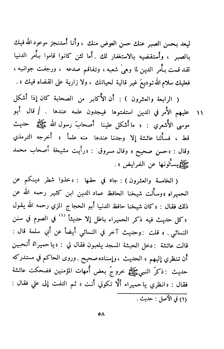 الْخَامِسُةُ وَالْعِشْرُوْنَ: جَاءَ فِيْ حَقِّهَا: خُذُوْا شَطْرَ دِيْنِكُمْ عَنِ الْحُمَيْرَاءِ" وَسَأَلَتُ شَيْخَنَا الْحَافِظَ عِمَادَالدِّيْنِ ابْنَ كَثِيْر رَحِمَهُ اللهُ عَنْ ذَلِكَ فَقَالَ: كَانَ شَيْخنَا حَافِظُ الدُّنْيَا أَبُوالْحَجّاجِ الْمِزِّيُّ رَحِمَهُ اللهُ يَقُوْلُ: كُلُّ حَدِيْثٍ فِيْهِ "الْحُمَيْرَاءُ" بَاطِلٌ إِلَّا حَدِيْثًا فِي الصَّوْم فِي سُنَنِ النَّسَائِيِّ. (3)
