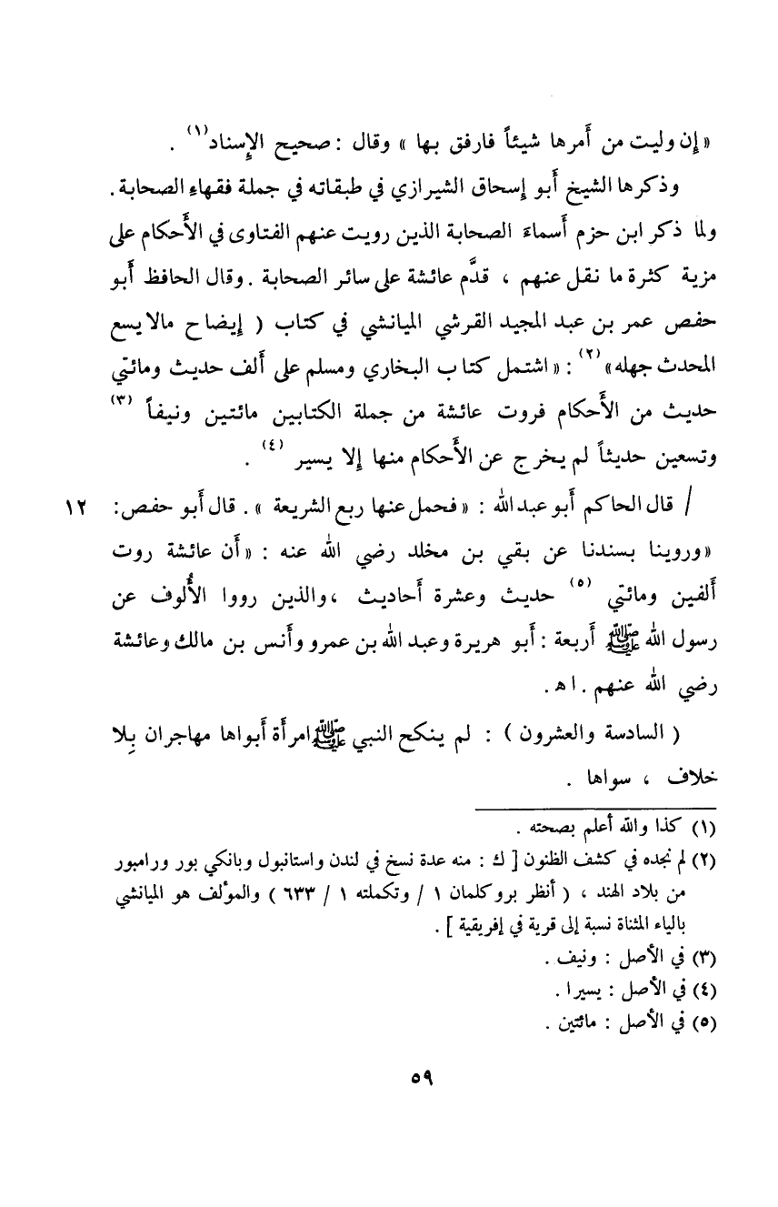 ... وَقَالَ الْحَافِظُ أَبُوْحَفْصٍ عُمَرُ بْنُ عَبْدِ الْمَجِيْدِ الْقُرَشِيُّ الْمِيَانَشِيُّ فِيْ كِتَابِ "إِيْضَاحُ مَإِلَّا يَسَعُ المحَدِّثَ جَهْلُهُ": اشْتَمَلَ كِتَابُ الْبُخَارِيِّ وَمُسْلِمٍ عَلَى أَلْف حَدِيْثٍ وَمِائَتَيْ حَدِيْثٍ مِنَ الْأَحْكَام فَرَوَتْ عَائِشَةُ مِنْ جُمْلَةِ الْكِتَابَيْنِ مِائَتَيْنِ وَنَيِّفًا وَتِسْعِيْنَ حَدِيْثًا لَمْ يَخْرُجْ عَنِ الْأَحْكَام مِنْهَا إِلَّا الْيَسِيْرُ.