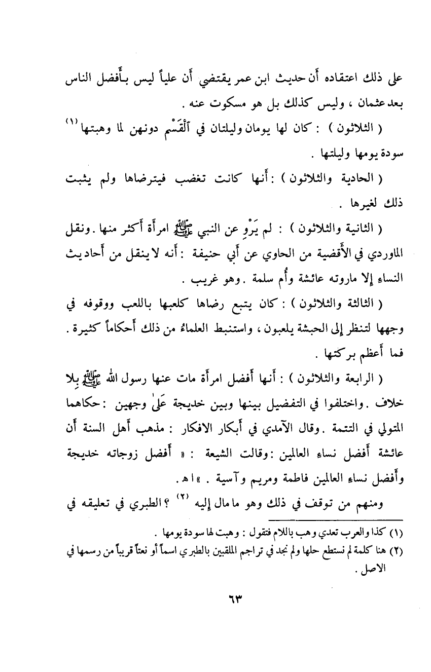 الرَّابِعُةُ وَالثَّلَاثُوْنَ: أَنَّهَا أَفْضَلُ امْرَأَةٍ مَاتَ عَنْهَا رَسُوْلُ اللهِ صَلَّى اللهُ عَلَيْهِ وَسَلَّمَ بِلَا خِلَافٍ. وَاخْتَلَفُوْا فِي التَّفْضِيْل بَينَهَا وَبَيْنَ خَدِيْجَةَ عَلَى وَجْهَيْنِ حَكَاهُمَا الْمُتَوَلِّيْ فِي "التَّتِمَّةِ".