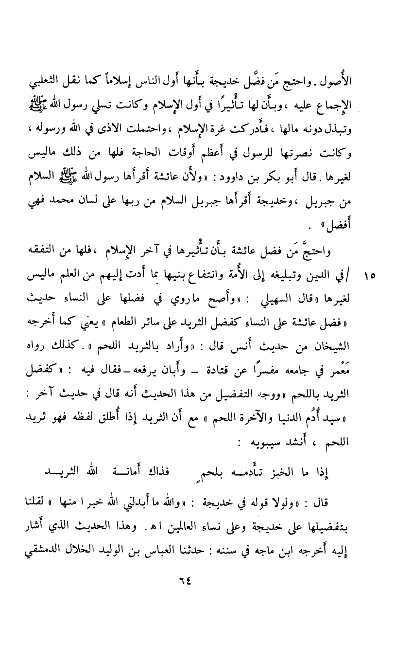 قَالَ: السُّهَيْلِيّ: وَأَصَحُّ مَا رُوِيَ فِيْ فَضْلِهَا عَلَى النِّسَاءِ حَدِيْثُ "فَضْلُ عَائِشَةَ عَلَى النِّسَاءِ كَفَضْلِ الثَّرِيْدِ عَلَى سَائِرِ الطَّعَامِ" يَعْنِيْ كَمَا أَخْرَجَهُ الشَّيْخَانِ مِنْ حَدِيْثِ أَنَسٍ قَالَ: وَأَرَادَ بالثَّرِيْدِ: اللَّحْمَ.