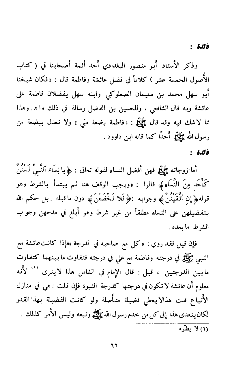 قِيْلَ: قَالَ: الْإِمَام فِي"الشَّامِلِ": هَذَا لَا يَترى لِأَنَّهُ معُلُوْمٌ إِنَّ عَائِشَةَ لَا تَكُوْنُ فِيْ دَرَجَتِهَا كَدَرَجَةِ النَّبُوَّةِ.