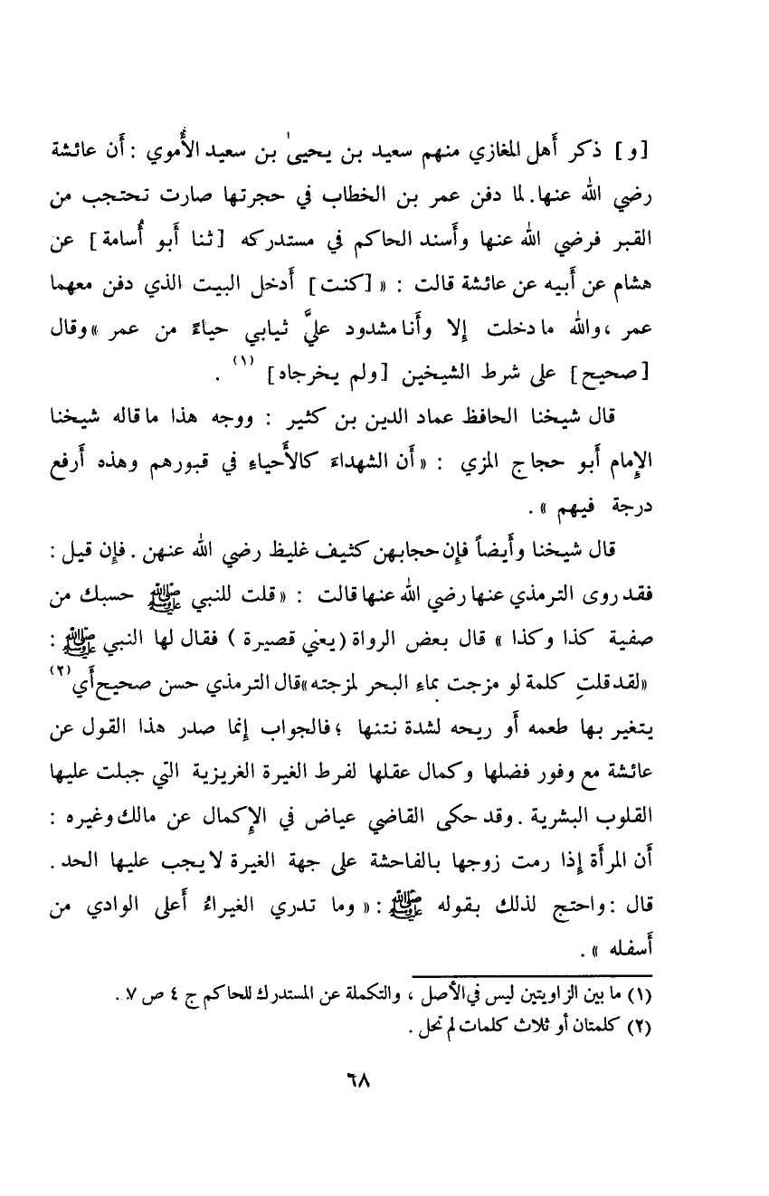 وَذَكَرَ أَهْلُ الْمَغَازِيْ مِنْهُمْ سَعِيْدُ بْنُ يَحْيَى بْنِ سَعِيْدٍ إِلَّامَوِيُّ إِنَّ عَائِشَةَ رَضِيَ اللهُ عَنْهُا لَمَّا دُفِنَ عُمَرُ بْنُ الْخَطَّابِ فِيْ حُجْرَتِهَا صَارَتْ تَحْتَجِبُ مِنَ الْقَبْرِ فَرَضِيَ اللهُ عَنْهُا.
