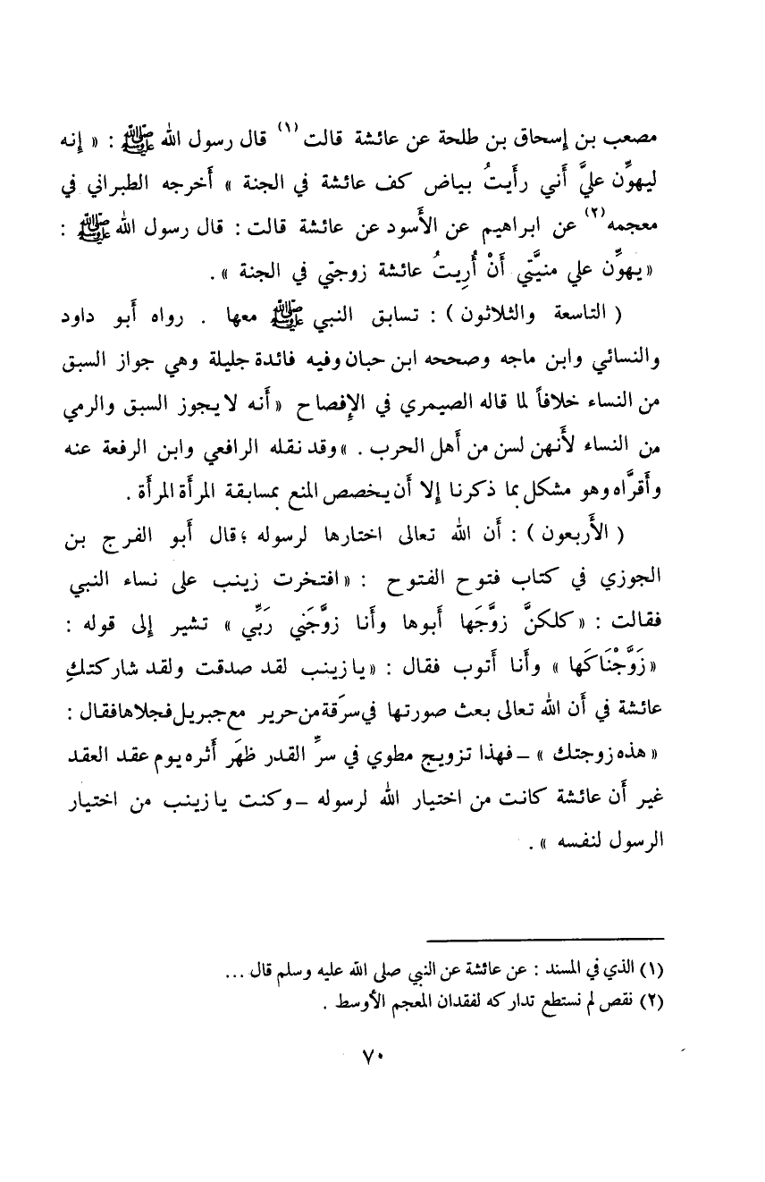 مُصْعَبِ بْنِ إِسْحَاقَ بْنِ طَلْحَةَ عَنْ عَائِشَةَ قَالَتْ: قَالَ رَسُوْلُ اللهِ صَلَّى اللهُ عَلَيْهِ وَسَلَّمَ: إِنَّهُ لَيُهَوِّنُ عَلَيَّ أَنِّيْ رَأَيْتُ بِيَاضَ كَفِّ عَائِشَةَ فِي الْجَنَّةِ. (1)