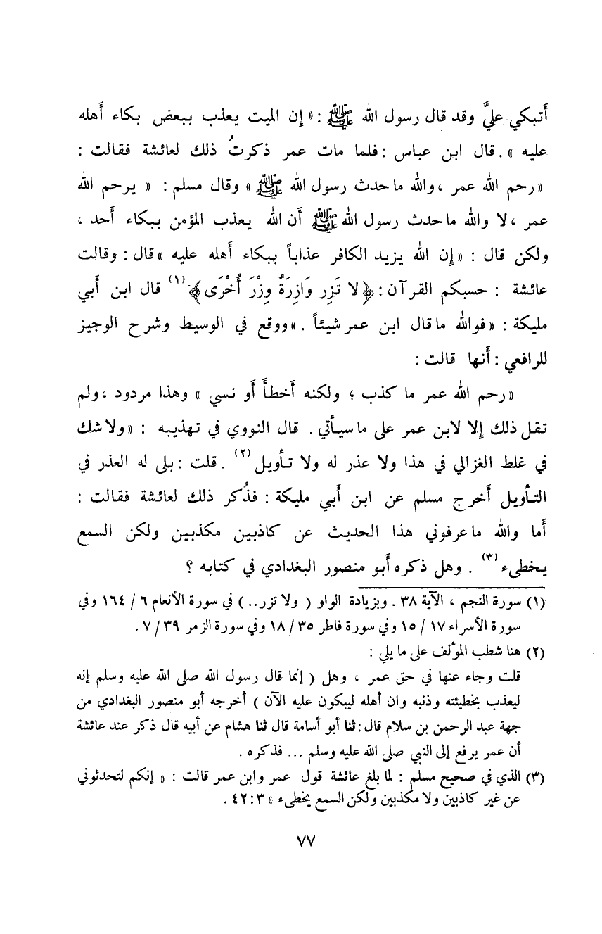 (5) . أخرجه مسلم، الصحيح،، باب الْمَيِّت يعذب ببكاء أهله عَلَيْهِ:1543 وَفِيْهِ: لَمَّا بَلَغَ عَائِشَةَ قَوْلُ عُمَرَ وَابْنِ عُمَرَ قَالَتْ: إِنَّكُمْ لَتُحَدِّثُونِّي عَنْ غَيْرِ كَاذِبَيْنِ وَلَا مُكَذَّبَيْنِ وَلَكِنَّ السَّمْعَ يُخْطِئُ