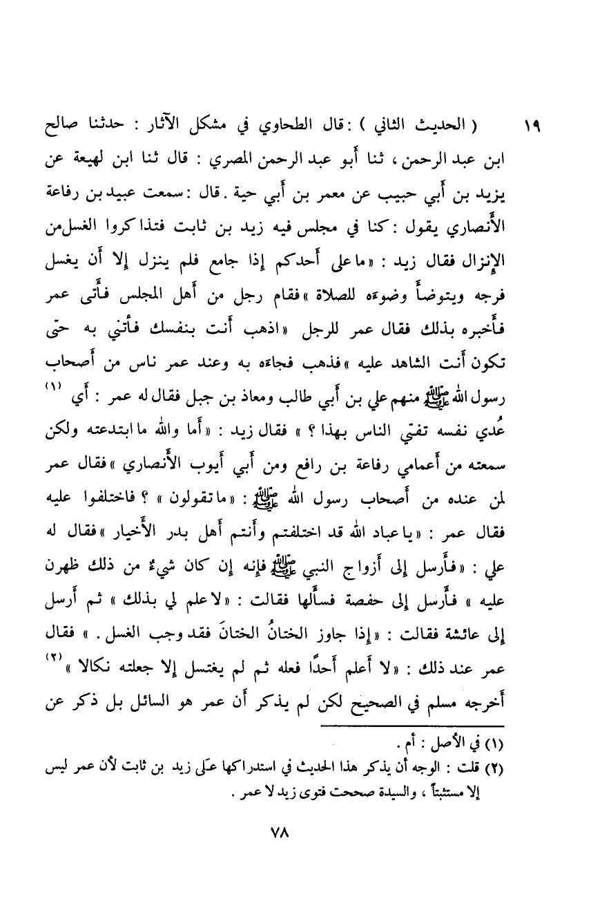 قَالَ الطَّحَاوِيُّ فِيْ "مُشْكَلِ الْآَثَار": حَدَّثَنَا صَالِحُ بْنُ عَبْدِ الرَّحْمَنِ ثَنَا أَبُوْعَبْدِ الرَّحْمَنِ الْمِصْرِيُّ قَالَ: ثَنَا ابْنُ لَهِيْعَةَ عَنْ يَزَيْد بْنِ أَبِيْ حَبِيْبٍ عَنْ مَعْمَرَ بْنِ أَبِيْ حَيَّةَ قَالَ: سَمِعت عُبَيْدَ بْنَ رِفَاعَةَ الْأَنْصَارِيَّ يَقُوْلُ: كُنَّا فِيْ مَجْلِس فِيْهِ زَيْد بْنُ ثَابِتٍ فَتَذَاكَرُوا الْغُسْلَ مِنَ الْإِنْزَالِِ