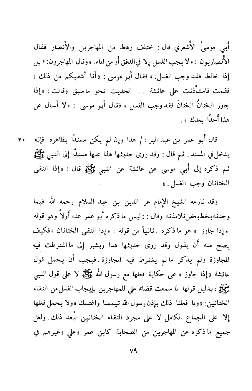 أَبِيْ مُوْسَى الْأَشْعَرِيِّ قَالَ: اخْتَلَفَ رَهْطٌ مِنَ الْمُهَاجِرِيْنَ والْأَنْصَارِِ فَقَالَ: الْأَنْصَارِيُّوْنَ: لَا يَجِبُ الْغُسْلِ إِلَّا فِي الدَّفْقِ أَوْمِنَ الْمَاءِ. وَقَالَ الْمُهَاجِرُوْنَ: بَلْ إِذَا خَالَطَ فَقَدْ وَجَبَ الْغُسْلُ. فَقَالَ أَبُوْمُوْسَى: أَنَا أشْفِيْكُمْ مِنْ ذَلِكَ فَاسْتَأْذَنَتُ عَلَى عَائِشَةَ الْحَدِيْث نَحْوَمَا سَبَقَ. وَقَالَتْ: إِذَاجَاوَزَالْخِتَانُ الْخِتَانَ فَقَدْ وَجَبَ الْغُسْلُ. فَقَالَ أَبُوْمُوْسَى: لَا أسْأَلَُ عَنْ هَذَا أَحَدًا بَعْدَك.