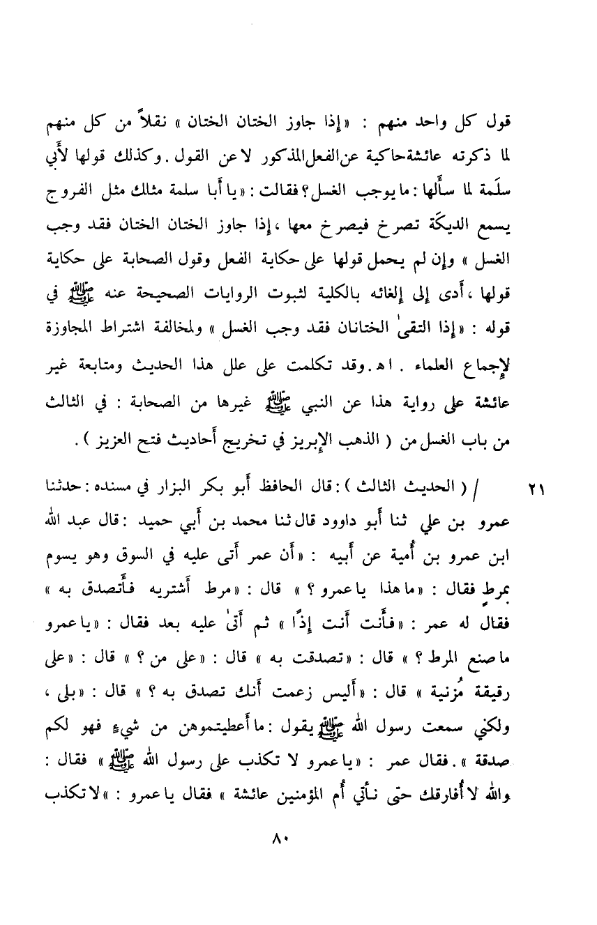 وَإِنْ لَمْ يُحْمَلْ قَوْلُهَا عَلَى حِكَايَةِ الْفِعْلِ وَقَوْلُ الصَّحَابَةِ عَلَى حِكَايَةِ قَوْلِهَا أَدَّى إِلَى إلْغَائِهِ بِالْكُلِّيَّةِ لِثُبُوْتِ الرِّوَايَاتِ الصَّحِيْحَةِ عَنْهُ صَلَّى اللهُ عَلَيْهِ وَسَلَّمَ فِيْ قَوْلِهِ: إِذَا الْتَقَى الْخِتَانَانِ فَقَدْ وَجَبَ الْغُسْلُ" وَلِمُخَالَفَةِ اشْتِرَاطِ الْمُجَاوَزَةِ لِإِجْمَاعِ الْعُلَمَاءِ. اهـ.