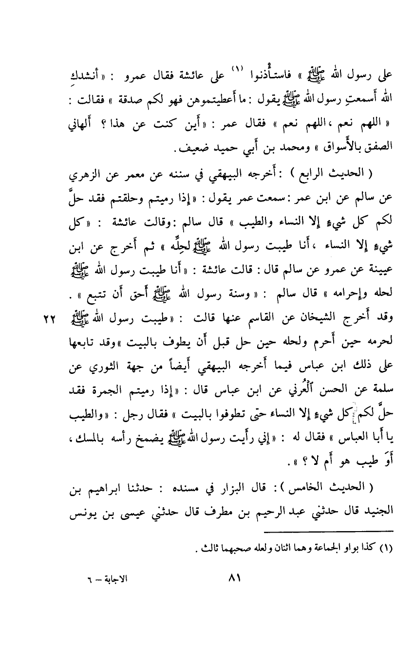 أَخْرَجَهُ الْبَيْهَقِيُّ فِيْ سُنَنِهِ عَنْ مَعْمَرَ عَنِ الزُّهْرِيِّ عَنْ سَالِمٍ عَنِ ابْنِ عُمَرَ سَمِعْتُ عُمَرَ يَقُوْلُ: إِذَا رَمَيْتُم وَحَلَقْتُمْ فَقَدْ حَلَّ لَكُمْ كُلُّ شَيْءٍ إِلَّا النِّسَاءُ وَالطِّيْبُ. قَالَ سَالِمٌ: وَقَالَتْ عَائِشَةُ: كُلُّ شَيْءٍ إِلَّا النِّسَاءَ، أَنَا طَيَّبْتُ رَسُوْلَ اللهِ صَلَّى اللهُ عَلَيْهِ وَسَلَّمَ لِحِلِّهِ.