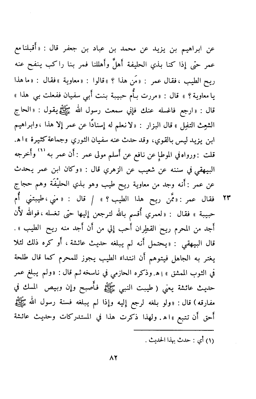 عَنْ إِبْرَاهِيْمَ بْنِ يَزَيْدَ عَنْ مُحَمَّدِ بْنِ عَبَّادِ بْنِ جَعْفَر قَالَ: أَقْبَلْنَا مَعَ عُمَرَ حَتَّى إِذَا كُنَّا بِذِي الْحُلَيْفَةِ أَهَلَّ وَأَهْلَلْنَا فَمَرَّ بِنَا رَاكِبٌ يَنْفَحُ عَنْهُ رِيْح الطِّيْبِ فَقَالَ عُمَرُ: مَنْ هَذَا؟ قَالُوْا: مُعَاوِيَةُ. فَقَالَ: مَا هَذَا يَا مُعَاوِيَةُ؟ قَالَ: مَرَرْتُ بِأُمِّ حَبِيْبَةَبِنْتِ أَبِيْ سُفْيَانَ فَفَعَلَتْ بِيْ هَذَا. قَالَ: ارْجِعْ فَاغْسِلْهُ عَنْكَ فَإِنِّيْ سَمِعْتُ رَسُوْلَ اللهِ صَلَّى اللهُ عَلَيْهِ وَسَلَّمَ يَقُوْلُ: الْحَاجُّ الشَّعِثُ التَّفِلُ.