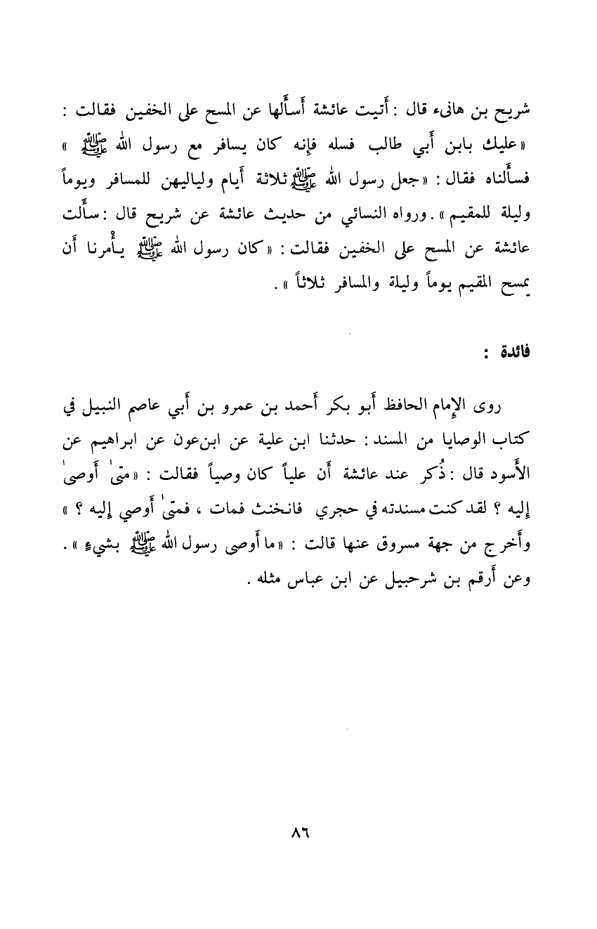 ... رَوَى الْإِمَام الْحَافِظ أَبُوْ بَكْرٍ أَحْمَد بْن عَمْرو بْن أَبِي عَاصِم النَّبِيّل فِي كِتَاب الْوَصَايَا فِي المُسْنَد حَدَّثَنَا ابْنُ عُلَيَّةَ عَنِ ابْنِ عَوْنٍ عَنْ إِبْرَاهِيْمَ عَنِ إِلَّاسْوَدِ قَالَ: ذُكِرَ عِنْدَ عَائِشَةَ أَنَّ عَلِيًّا كَانَ وَصِيًّافَقَالَتْ: مَتَى أَوْْصَى إِلَيْهِ لَقَدْ كُنْتُ مُسْنَدَتَهُ فِيْ حِجْرِيْ فَانْخَنَثَ فَمَاتَ فَمَتَى أَوْصَى إِلَيْهِ؟