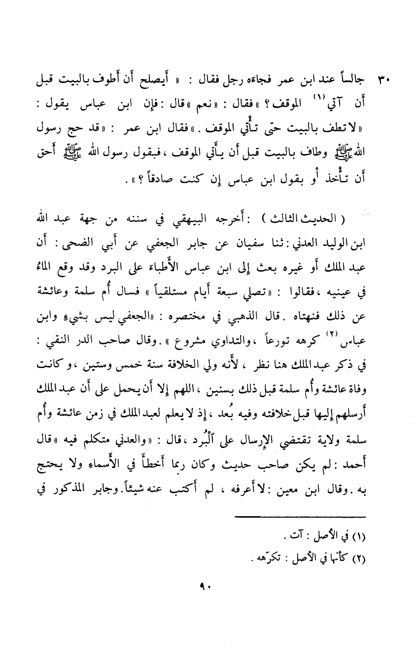 ... أَخْرَجَهُ الْبَيْهَقِيُّ فِيْ سُنَنِهِ مِنْ جِهَةِ عَبْدِ اللهِ بْنِ الْوَلِيْدِ الْعَدْنِيّ ثَنَا سُفْيَانَ عَنْ جَابِرٍالْجُعْفِيِّ عَنْ أَبِي الضُّحَى أَنَّ عَبْدَ الْمَلِكِ أَوْ غَيْرَهُ بَعَثَ إِلَى ابْنِ عَبَّاسٍ الْأَطِبَّاءَ عَلَى الْبردِ وقَدْ وَقَعَ الْمَاء فِي عَيْنَيْهِ فقَالُوْا: تُصَلِّيْ سَبْعَةَ أَيَّامٍ مُسْتَلْقِيًا، فسَأَلَ أُمَّ سَلَمَةَ وَعَائِشَةَ عَنْ ذَلِكَ فَنَهَتَاهُ.