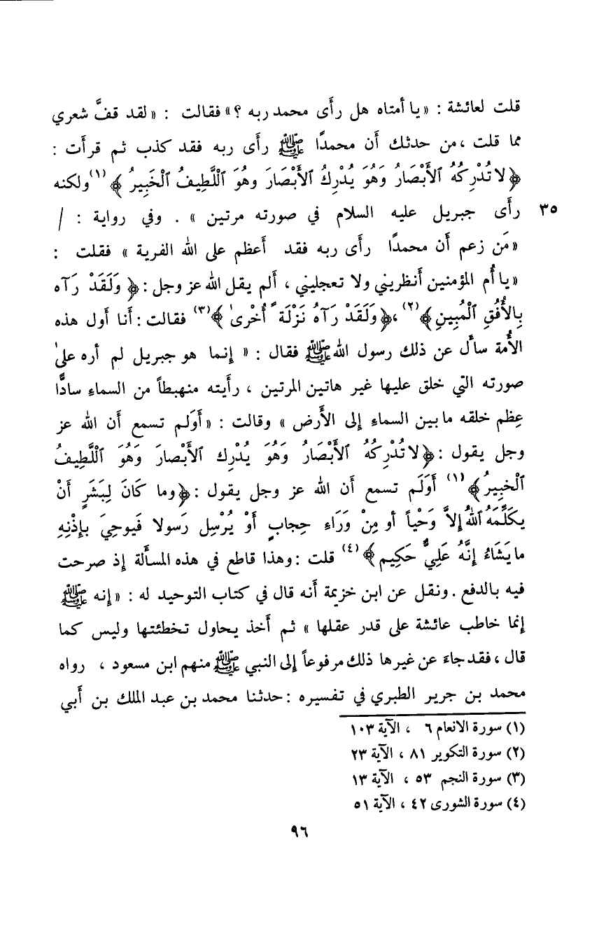 وَفِيْ رِوَايَةٍ: مَنْ زَعَمَ أن مُحَمَّدا رَأَى رَبَّهُ فَقَدْ أَعْظَمَ عَلَى اللهِ الْفِرْيَة. فقُلْتُ: يَا أُمَّ الْمُؤْمِنِيْنَ! انْظُرِيْنِيْ وَلَا تَعْجِلِيْنِيْ أَلَمْ يَقُلْ عَزَّوَجَلَّ: {وَلَقَدْ رَآهُ بِالْأُفُقِ الْمُبِينِ} (2) {وَلَقَدْ رَآَهُ نَزْلَةً أُخْرَى} (3) فَقَالَتْ: أَنَا أَوَّلُ هَذِهِ الْأُمَّةِ سَأَلَ عَنْ ذَلِكَ رَسُوْلَ اللهِ صَلَّى اللهُ عَلَيْهِ وَسَلَّمَ فَقَالَ: إِنَّمَا هُوَ جِبْرِيْلُ لَمْ أَرَهُ عَلَى عِظَمِ خَلْقِهِ مَا بَيْنَ السَّمَاءِ إِلَى الْأَرْضِ وَقَالَتْ: أَوَلَمْ تَسْمَعْ أَنَّ اللهَ عَزَّ وَجَلَّ يَقُوْلُ: {لَاتُدْرِكُهُ الأَبْصَارُ وَهُوَ يُدْرِكُ الأَبْصَارَ وَهُوَ اللَّطِيفُ الْخَبِيرُ} (4) أَوَلَمْ تَسْمَعْ أَنَّ اللهَ عَزَّوَجَلَّ يَقُوْلُ: {وَمَا كَانَ لِبَشَرٍ أَن يُكَلِّمَهُ اللَّهُ إِلَّا وَحْياً أَوْ مِن وَرَاء حِجَابٍ أَوْ يُرْسِلَ رَسُولاً فَيُوحِيَ بِإِذْنِهِ مَا يَشَاءُ إِنَّهُ عَلِيٌّ حَكِيمٌ} (5) قُلْت: وَهَذَا قَاطِعٌ فِيْ هَذِهِ الْمسَأَلَةِ إِذْ صَرَّحَتْ فِيْهِ بِالدَّفْعِ.