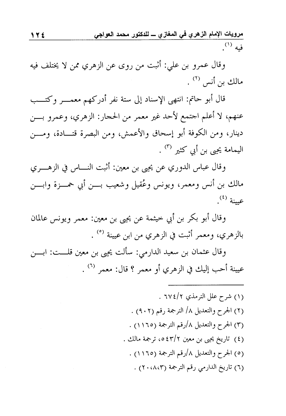 وقال عثمان بن سعيد الدارمي: "سألت يحيى بن معين قلت: ابن عيينة أحب إليك في الزهري أو معمر؟ قال: معمر"6.