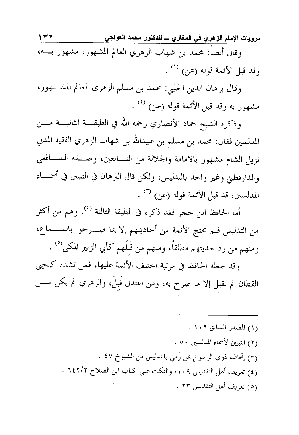 وذكره الشيخ حماد الأنصاري رحمه الله في الطبقة الثانية من المدلسين فقال: محمد بن مسلم بن عبيد الله بن شهاب الزهري الفقيه المدني نزيل الشام مشهور بالإمامة والجلالة من التابعين، وصفه الشافعي والدارقطني وغير واحد بالتدليس، ولكن قال البرهان في التبيين في أسماء المدلسين، قد قبل الأئمة قوله (عن) 3.