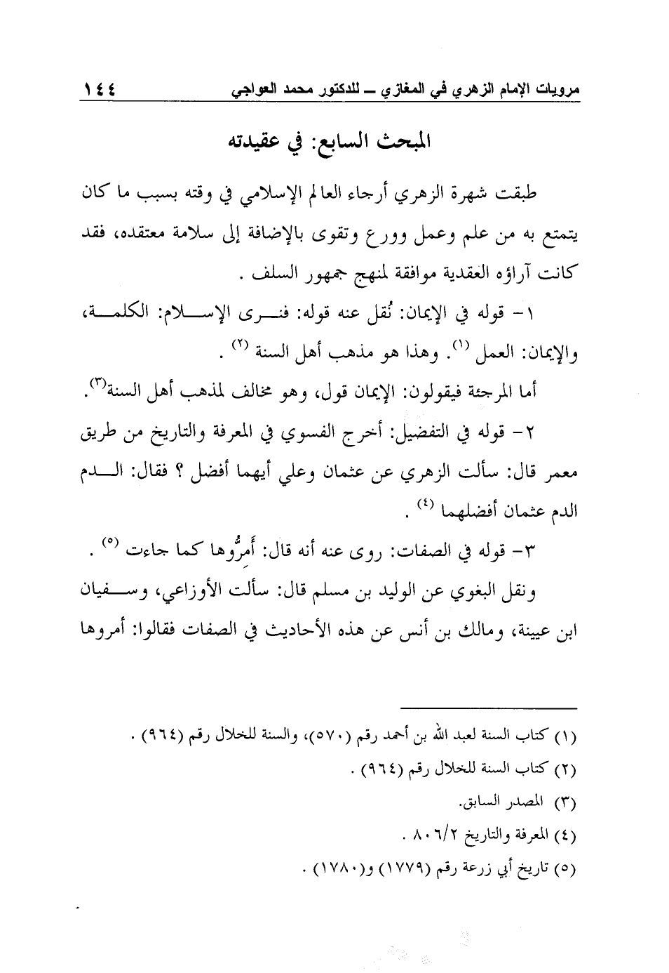 2- قوله في التفضيل: أخرج الفسوي في المعرفة والتاريخ من طريق معمر قال: "سألت الزهري عن عثمان وعلي أيهما أفضل؟ فقال: الدم الدم عثمان أفضلهما"4.