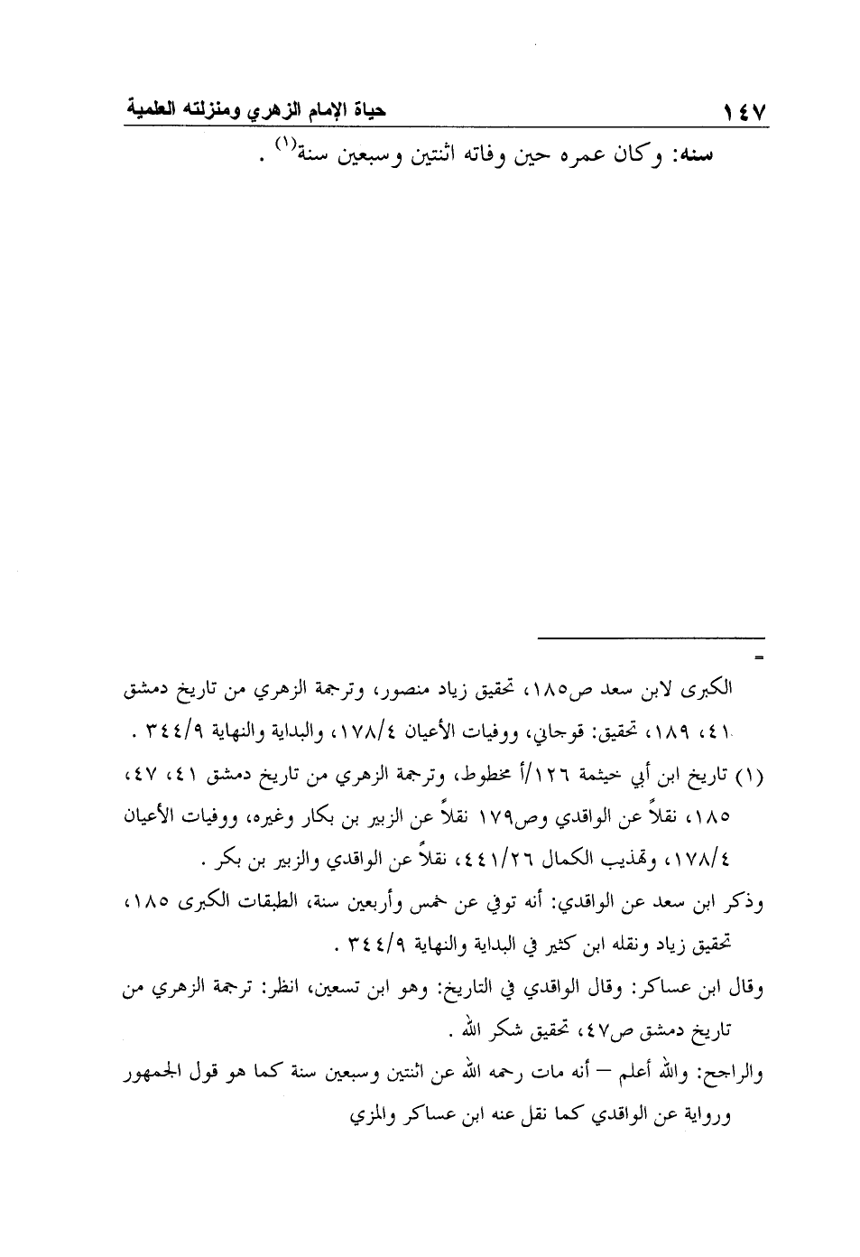 1 تاريخ ابن أبي خيثمة 126/أمخطوط، وترجمة الزهري من تاريخ دمشق 41، 47، 185، نقلاً عن الواقدي وص179 نقلاً عن الزبير بن بكار وغيره، ووفيات الأعيان 4/178، وتهذيب الكمال 26/441، نقلاً عن الواقدي والزبير بن بكر.