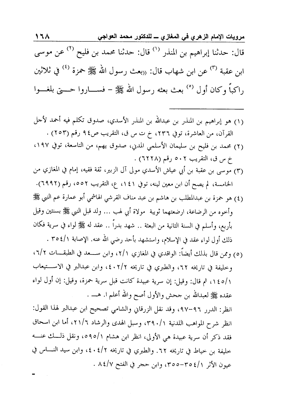 قال: حدثنا إبراهيم بن المنذر1 قال: حدثنا محمد بن فليح2 عن موسى ابن عقبة3 عن ابن شهاب قال: "بعث رسول الله صلى الله عليه وسلم حمزة4 في ثلاثين راكباً وكان أول5 بعث بعثه رسول الله صلى الله عليه وسلم - فساروا حتى بلغوا