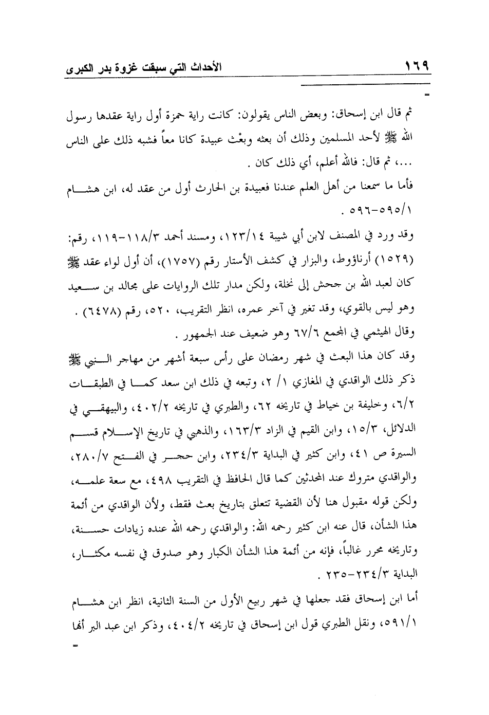 ثم قال ابن إسحاق: "وبعض الناس يقولون: كانت راية حمزة أول راية عقدها رسول الله صلى الله عليه وسلم لأحد المسلمين وذلك أن بعثه وبعْث عبيدة كانا معاً فشبه ذلك على الناس ... "، ثم قال: "فالله أعلم، أي ذلك كان، فأما ما سمعنا من أهل العلم عندنا فعبيدة بن الحارث أول من عقد له"، ابن هشام 1/595-596.
