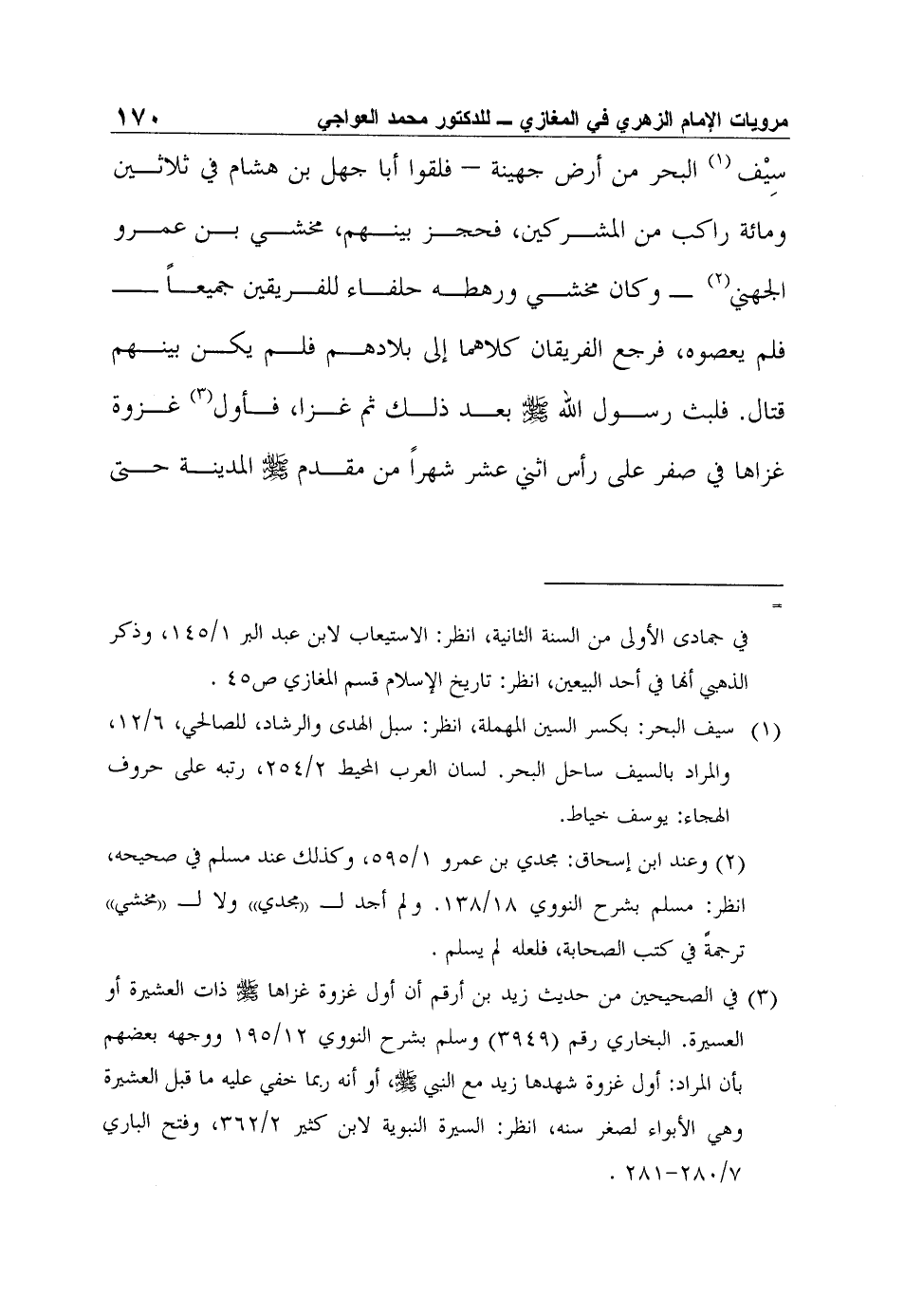 3 في الصحيحين من حديث زيد بن أرقم أن أول غزوة غزاها صلى الله عليه وسلم ذات العشيرة أو العسيرة. البخاري رقم (3949) وسلم بشرح النووي 12/195 ووجهه بعضهم بأن المراد: أول غزوة شهدها زيد مع النبي صلى الله عليه وسلم، أو أنه ربما خفي عليه ما قبل العشيرة وهي الأبواء لصغر سنه، انظر: السيرة النبوية لابن كثير 2/362، وفتح الباري 7/280-281.
