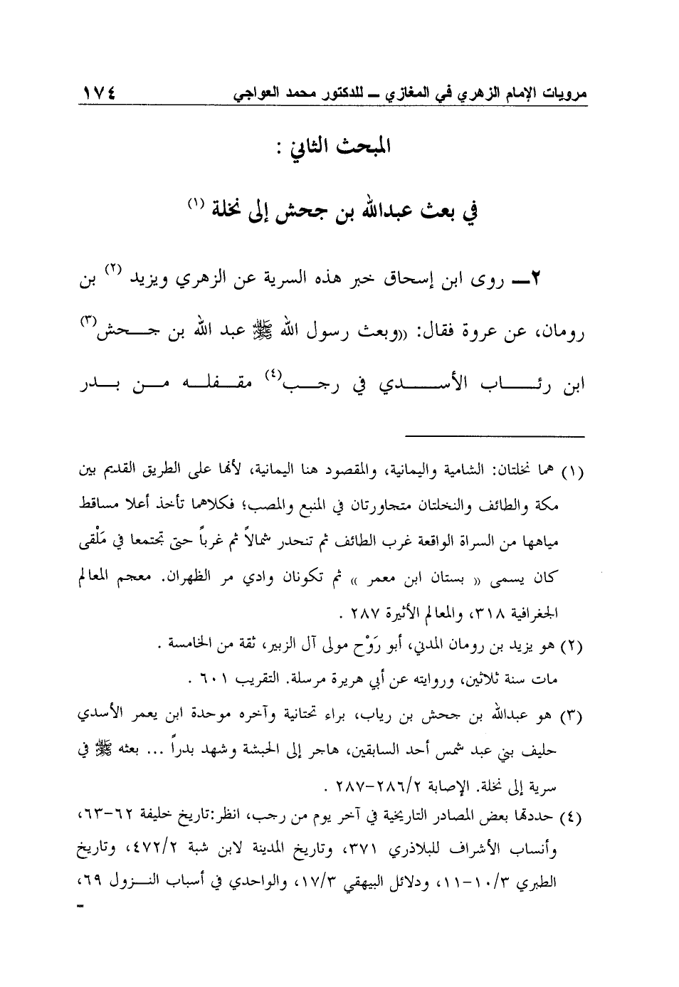 2ـ روى ابن إسحاق خبر هذه السرية عن الزهري ويزيد2 بن رومان، عن عروة فقال: "وبعث رسول الله صلى الله عليه وسلم عبد الله بن جحش3 ابن رئاب الأسدي في رجب4 مقفله من بدر