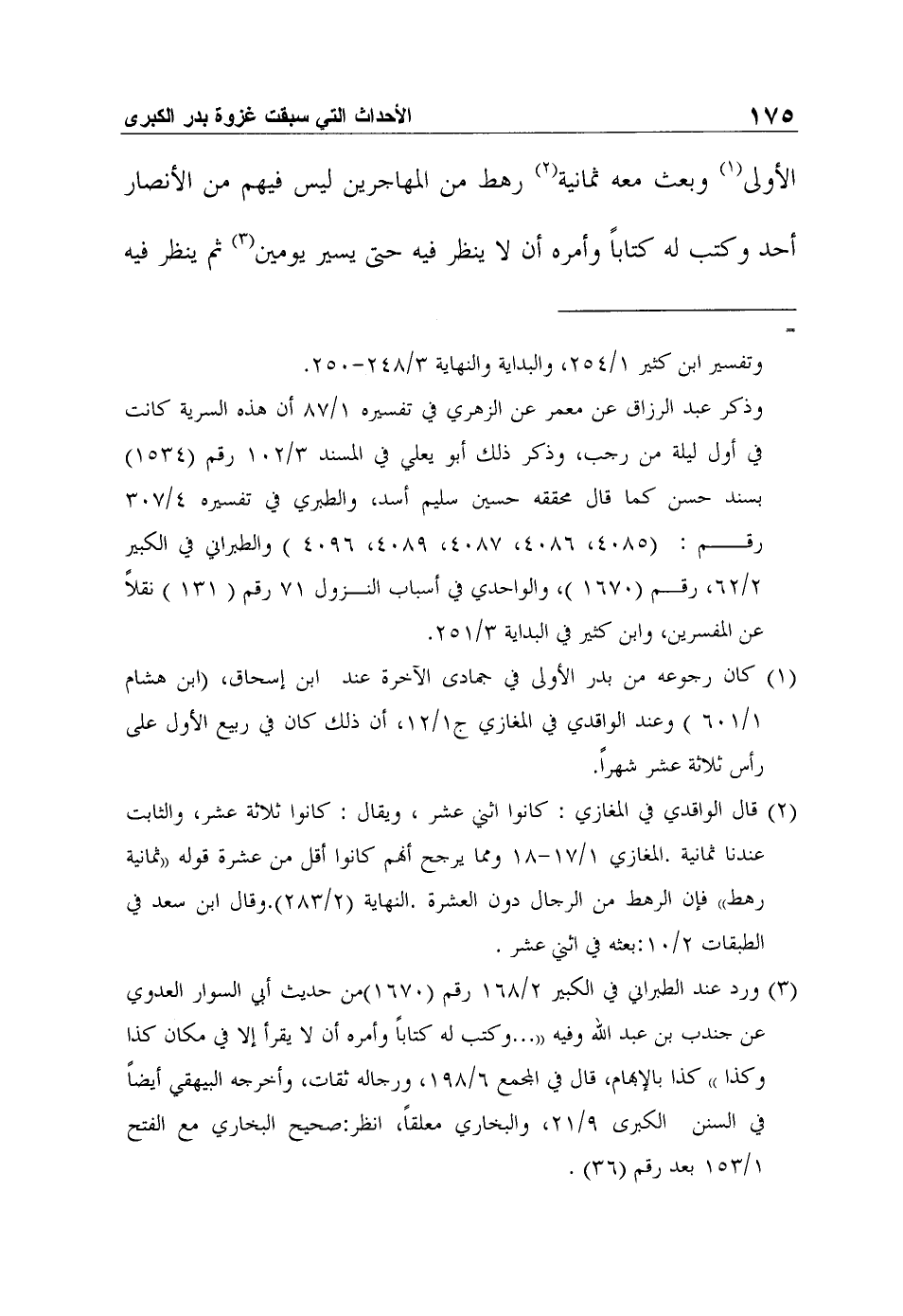1 كان رجوعه من بدر الأولى في جمادى الآخرة عند ابن إسحاق، (ابن هشام 1/601) وعند الواقدي في المغازي ج1/12، أن ذلك كان في ربيع الأول على رأس ثلاثة عشر شهراً.