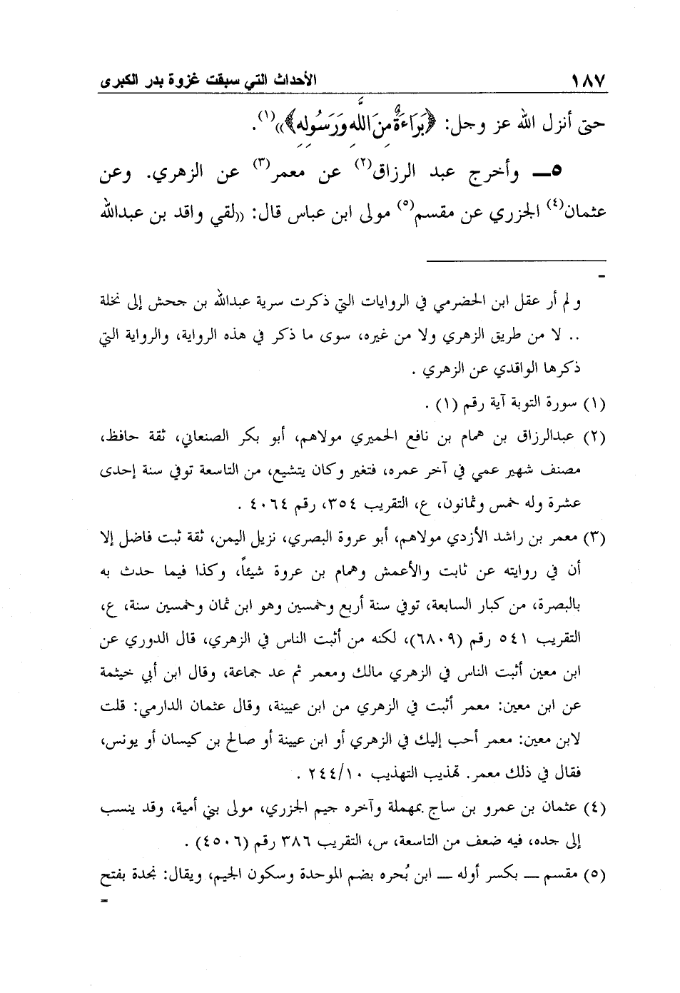 5- وأخرج عبد الرزاق2 عن معمر3 عن الزهري. وعن عثمان4 الجزري عن مقسم5 مولى ابن عباس قال: "لقي واقد بن عبد الله