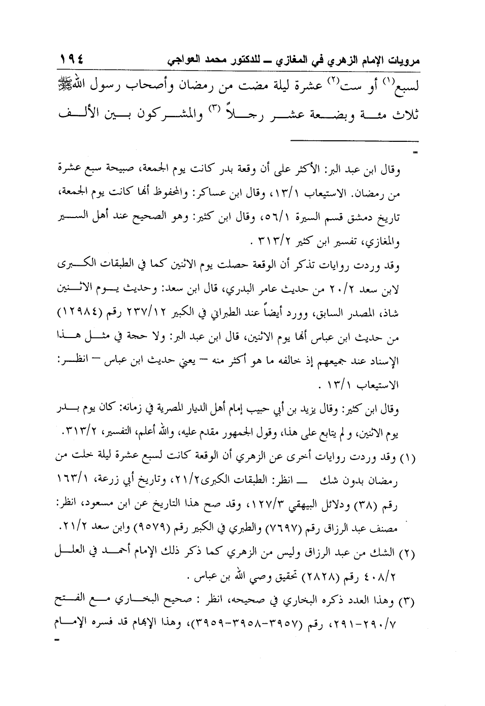 1 وقد وردت روايات أخرى عن الزهري أن الوقعة كانت لسبع عشرة ليلة خلت من رمضان بدون شك - انظر: الطبقات الكبرى2/21، وتاريخ أبي زرعة، 1/163 رقم (38) ودلائل البيهقي 3/127، وقد صح هذا التاريخ عن ابن مسعود، انظر: مصنف عبد الرزاق رقم (7697) والطبري في الكبير رقم (9579) وابن سعد 2/21.