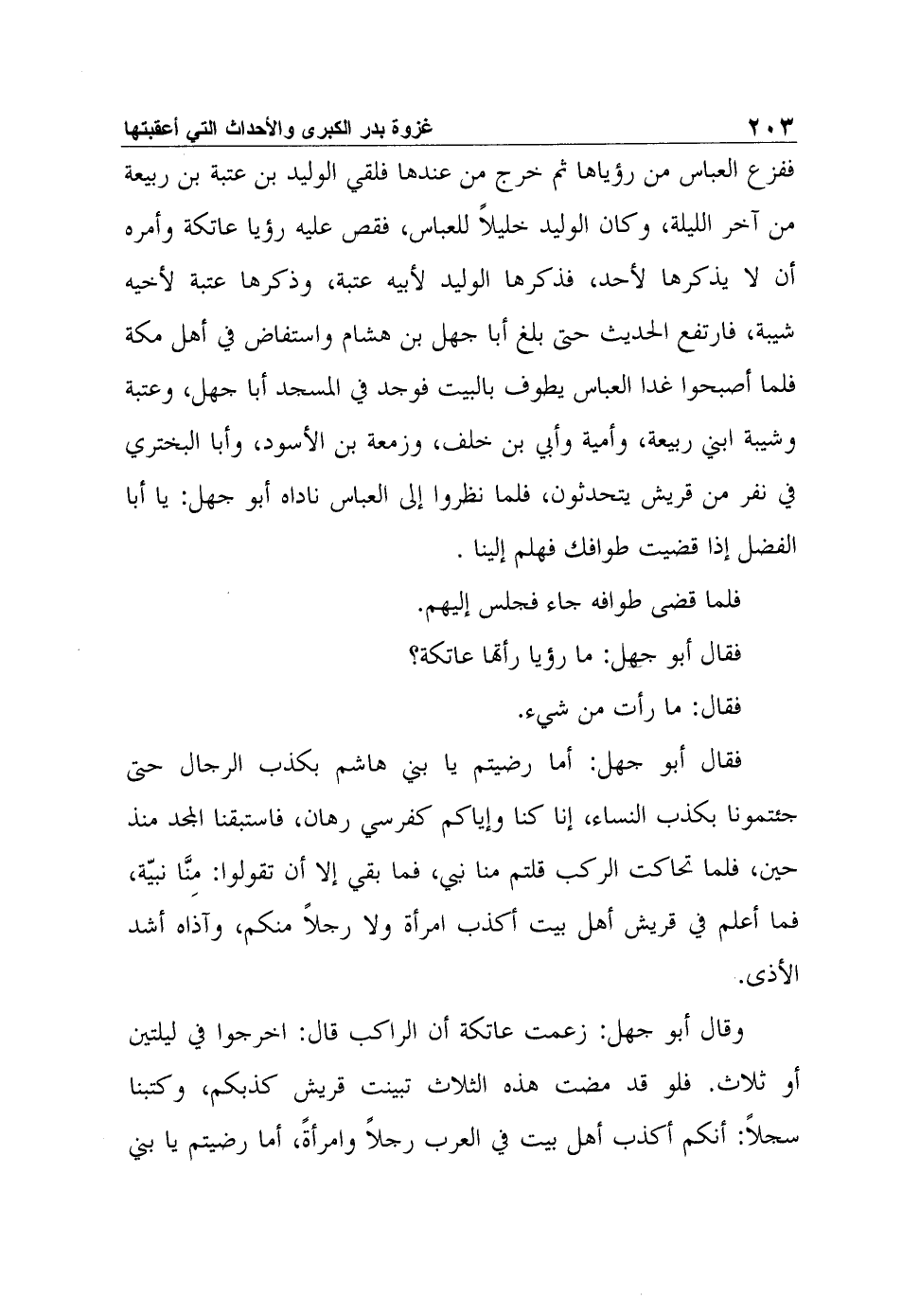 وقال أبو جهل: زعمت عاتكة أن الراكب قال: اخرجوا في ليلتين أو ثلاث. فلو قد مضت هذه الثلاث تبينت قريش كذبكم، وكتبنا سجلاً: أنكم أكذب أهل بيت في العرب رجلاً وامرأةً، أما رضيتم يا بني