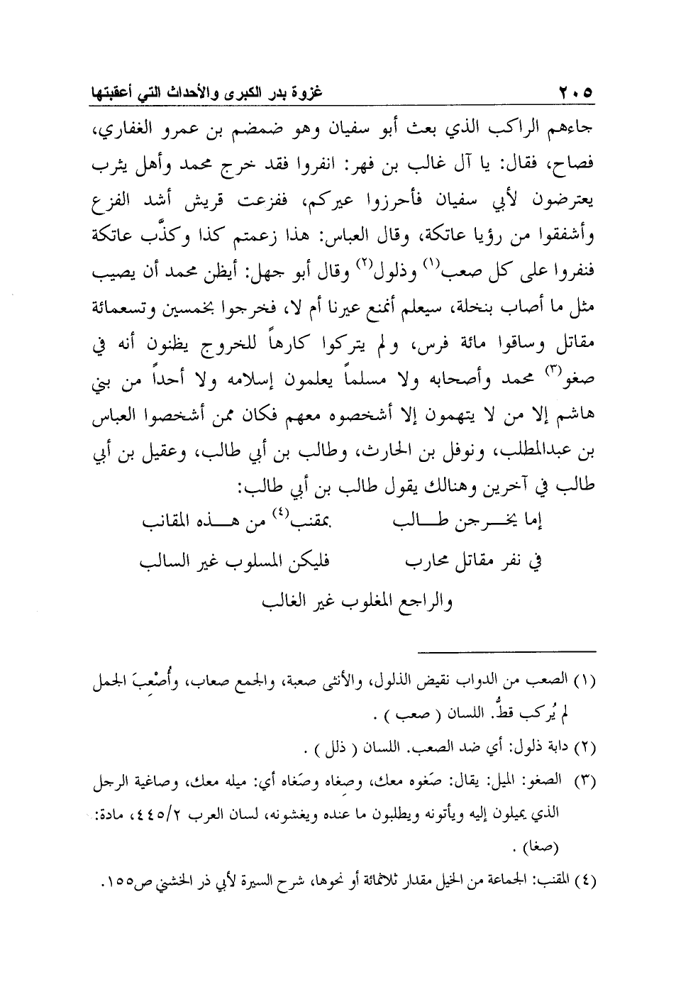 جاءهم الراكب الذي بعث أبو سفيان وهو ضمضم بن عمرو الغفاري، فصاح، فقال: يا آل غالب بن فهر: انفروا فقد خرج محمد وأهل يثرب يعترضون لأبي سفيان فأحرزوا عيركم، ففزعت قريش أشد الفزع وأشفقوا من رؤيا عاتكة، وقال العباس: هذا زعمتم كذا وكذَّب عاتكة فنفروا على كل صعب1 وذلول2 وقال أبو جهل: أيظن محمد أن يصيب مثل ما أصاب بنخلة، سيعلم أنمنع عيرنا أم لا، فخرجوا بخمسين وتسعمائة مقاتل وساقوا مائة فرس، ولم يتركوا كارهاً للخروج يظنون أنه في صغو3 محمد وأصحابه ولا مسلماً يعلمون إسلامه ولا أحداً من بني هاشم إلا من لا يتهمون إلا أشخصوه معهم فكان ممن أشخصوا العباس بن عبد المطلب، ونوفل بن الحارث، وطالب بن أبي طالب، وعقيل بن أبي طالب في آخرين وهنالك يقول طالب بن أبي طالب: