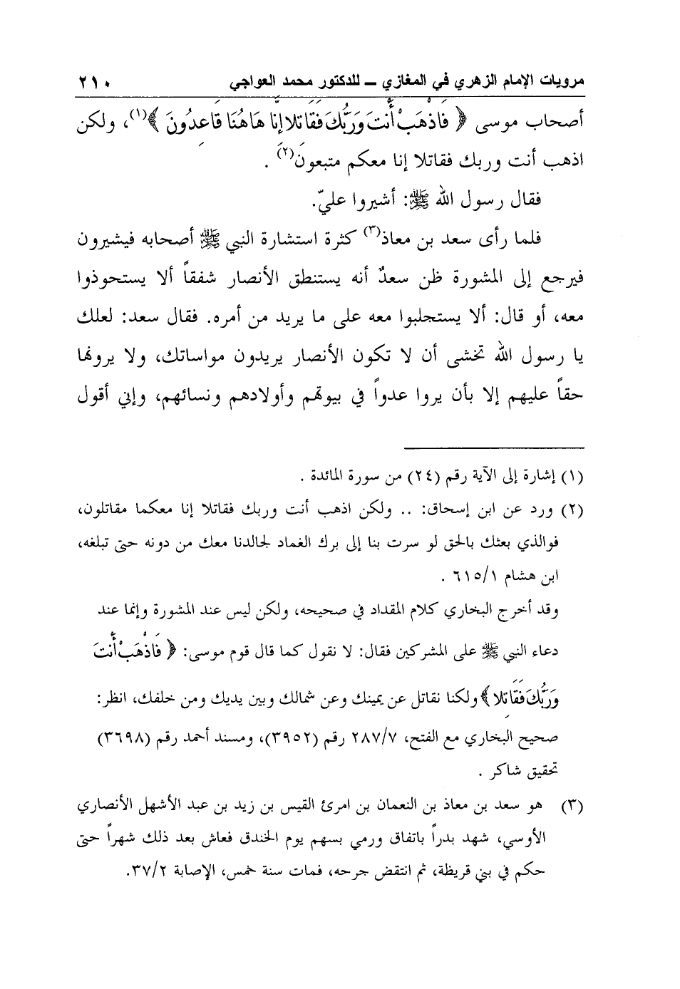 2 ورد عن ابن إسحاق: ".. ولكن اذهب أنت وربك فقاتلا إنا معكما مقاتلون، فوالذي بعثك بالحق لو سرت بنا إلى برك الغماد لجالدنا معك من دونه حتى تبلغه"، ابن هشام 1/615.