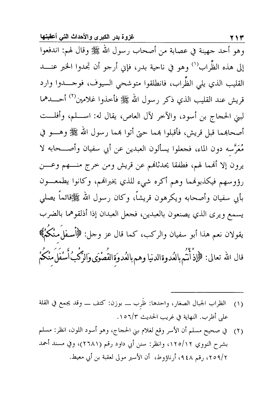 وهو أحد جهينة في عصابة من أصحاب رسول الله صلى الله عليه وسلم وقال لهم: اندفعوا إلى هذه الظِّراب1 وهو في ناحية بدر، فإني أرجو أن تجدوا الخبر عند القليب الذي يلي الظِّراب، فانطلقوا متوشحي السيوف، فوجدوا وارد قريش عند القليب الذي ذكر رسول الله صلى الله عليه وسلم فأخذوا غلامين2 أحدهما لبني الحجاج بن أسود، والآخر لآل العاص، يقال له: اسلم، وأفلت أصحابهما قبل قريش، فأقبلوا بهما حتى أتوا بهما رسول الله صلى الله عليه وسلم وهو في مُعَرَّسِه دون الماء، فجعلوا يسألون العبدين عن أبي سفيان وأصحابه لا يرون إلا أنهما لهم، فطفقا يحدثانهم عن قريش ومن خرج منهم وعن رؤوسهم فيكذبونهما وهم أكره شيء للذي يخبرانهم، وكانوا يطمعون بأبي سفيان وأصحابه ويكرهون قريشاً، وكان رسول الله صلى الله عليه وسلمقائماً يصلي يسمع ويرى الذي يصنعون بالعبدين، فجعل العبدان إذا أذلقوهما بالضرب يقولان نعم هذا أبو سفيان والركب، كما قال عز وجل: {أسفلَ مِنْكُمْ} قال الله تعالى: {إذْ أَنْتُم بالعُدوة الدنيا وهم بالعُدوَةِ القُصْوَى وَالرَّكْبُ أَسْفَلَ مِنْكُمْ