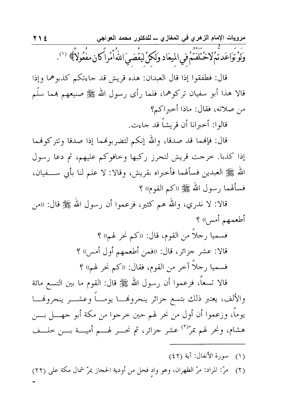 قالا تسعاً، فزعموا أن رسول الله صلى الله عليه وسلم قال: القوم ما بين التسع مائة والألف، يعتبر ذلك بتسع جزائر ينحرونها يوماً وعشر ينحرونها يوماً، وزعموا أن أول من نحر لهم حين خرجوا من مكة أبو جهل بن هشام، ونحر لهم بمرّ2 عشر جزائر، ثم نحر لهم أمية بن خلف