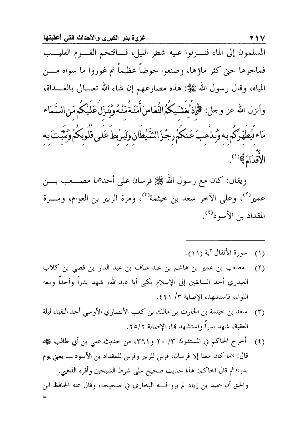 4 أخرج الحاكم في المستدرك 3/ 20 و361، من حديث علي بن أبي طالب رضي الله عنه قال: "ما كان معنا إلا فرسان، فرس للزبير وفرس للمقداد بن الأسود - يعني يوم بدر" ثم قال الحاكم: "هذا حديث صحيح على شرط الشيخين" وأقره الذهبي.