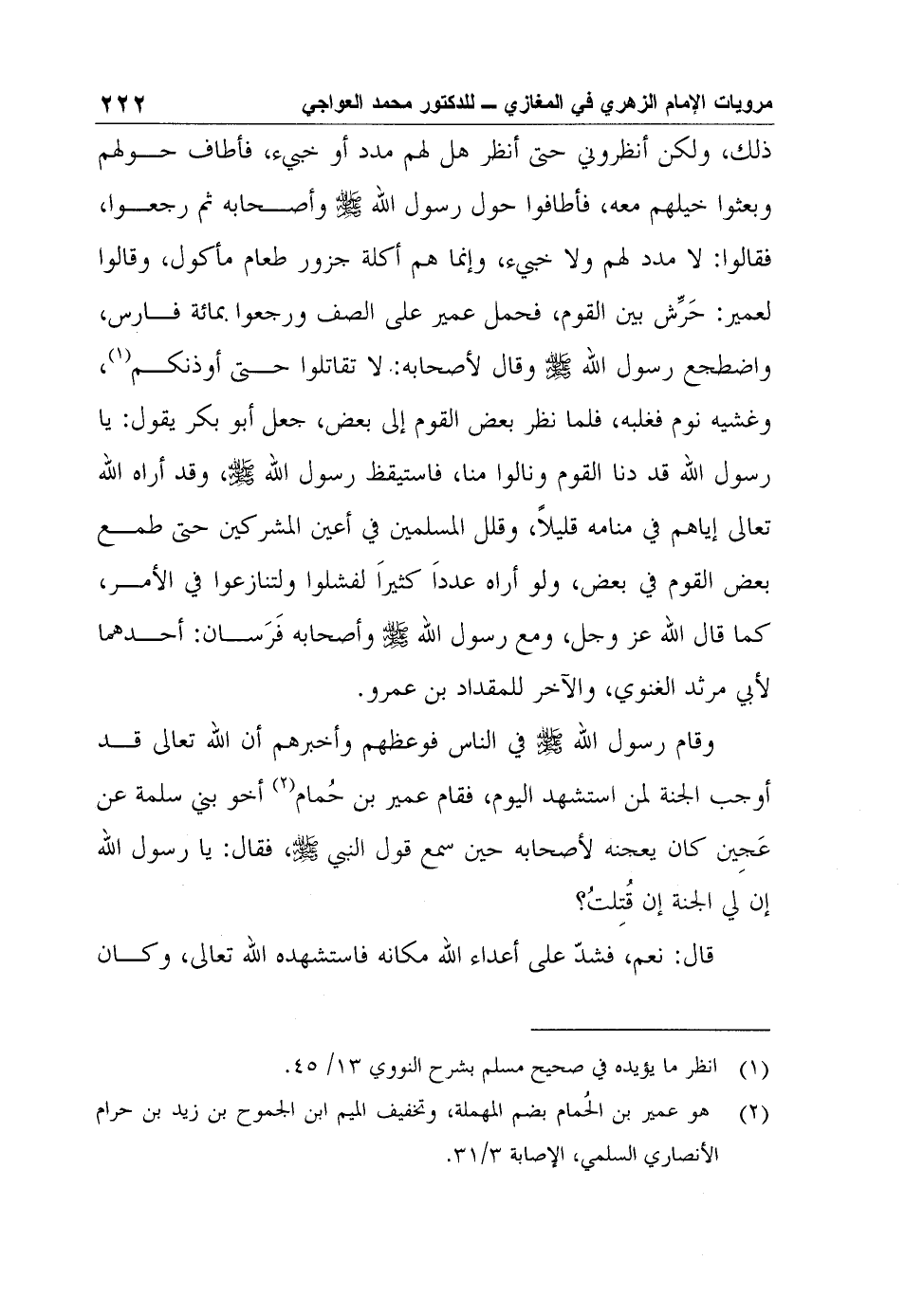 2 هو عمير بن الحُمام بضم المهملة، وتخفيف الميم ابن الجموح بن زيد بن حرام الأنصاري السلمي، الإصابة 3/31.