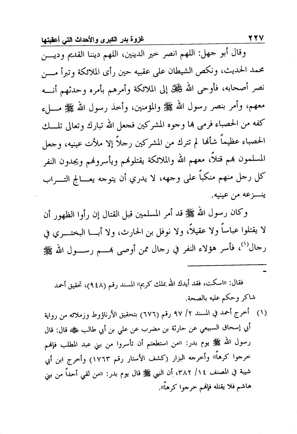 1 أخرج أحمد في المسند 2/ 97 رقم (676) بتحقيق الأرناؤوط وزملائه من رواية أبي إسحاق السبيعي عن حارثة بن مضرب عن علي بن أبي طالب رضي الله عنه قال: قال رسول الله صلى الله عليه وسلم يوم بدر: "من استطعتم أن تأسروا من بني عبد المطلب فإنهم خرجوا كرهاً" وأخرجه البزار (كشف الأستار رقم 1763) وأخرج ابن أبي شيبة في المصنف 14/ 382، أن النبي صلى الله عليه وسلم قال يوم بدر: "من لقي أحداً من بني هاشم فلا يقتله فإنهم خرجوا كرهاً".