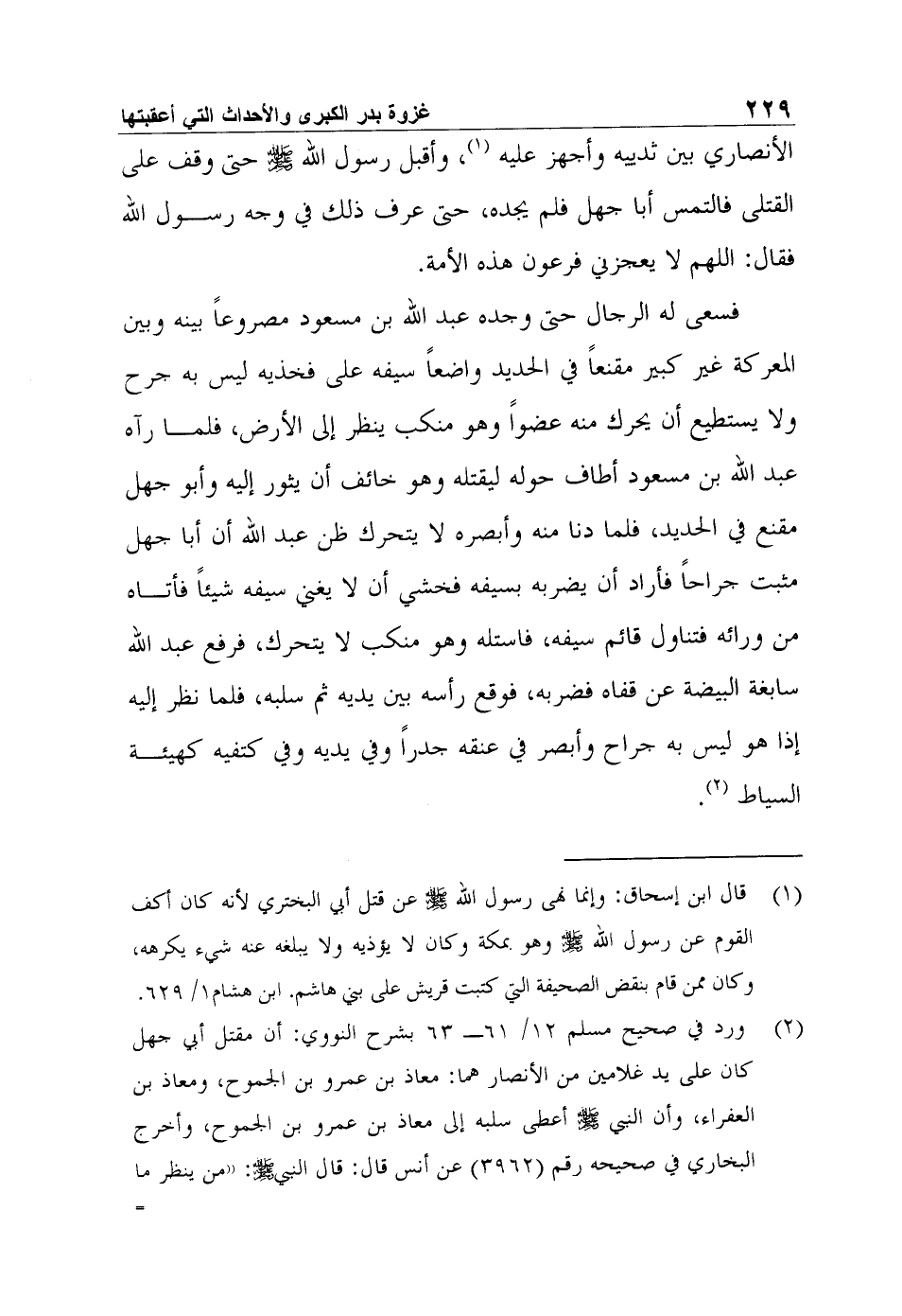 فسعى له الرجال حتى وجده عبد الله بن مسعود مصروعاً بينه وبين المعركة غير كبير مقنعاً في الحديد واضعاً سيفه على فخذيه ليس به جرح ولا يستطيع أن يحرك منه عضواً وهو منكب ينظر إلى الأرض، فلما رآه عبد الله بن مسعود أطاف حوله ليقتله وهو خائف أن يثور إليه وأبو جهل مقنع في الحديد، فلما دنا منه وأبصره لا يتحرك ظن عبد الله أن أبا جهل مثبت جراحاً فأراد أن يضربه بسيفه فخشي أن لا يغني سيفه شيئاً فأتاه من ورائه فتناول قائم سيفه، فاستله وهو منكب لا يتحرك، فرفع عبد الله سابغة البيضة عن قفاه فضربه، فوقع رأسه بين يديه ثم سلبه، فلما نظر إليه إذا هو ليس به جراح وأبصر في عنقه جدراً وفي يديه وفي كتفيه كهيئة السياط2.