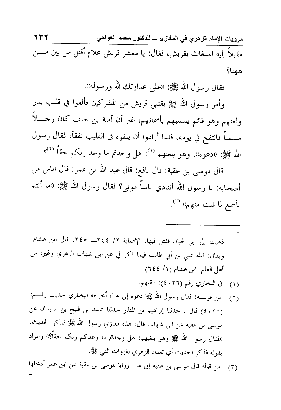 قال موسى بن عقبة: قال نافع: قال عبد الله بن عمر: قال أناس من أصحابه: يا رسول الله أتنادي ناساً موتى؟ فقال رسول الله صلى الله عليه وسلم: "ما أنتم بأسمع لما قلت منهم"3.