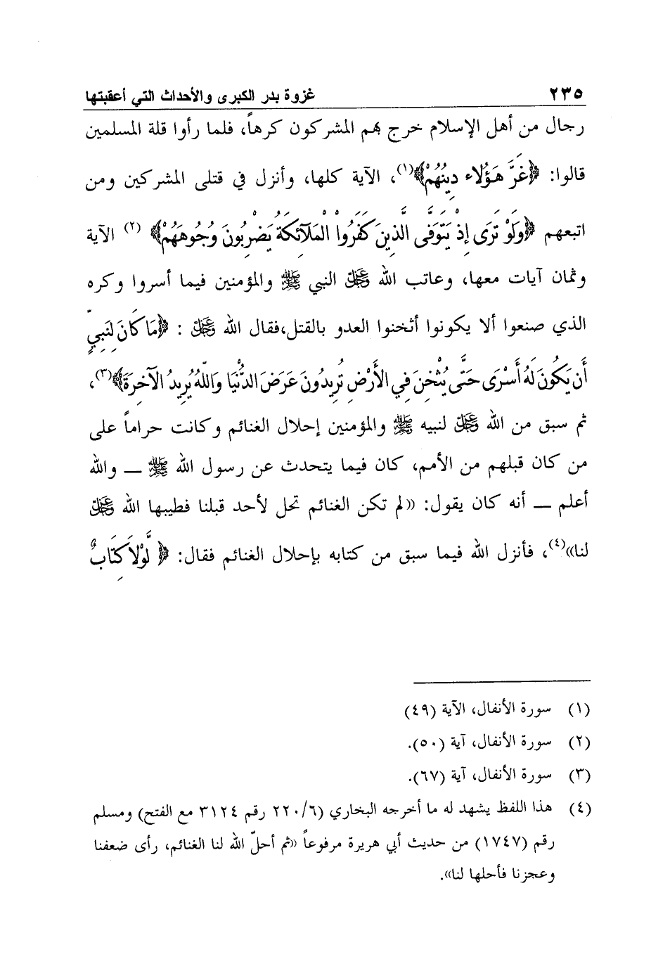 رجال من أهل الإسلام خرج بهم المشركون كرهاً، فلما رأوا قلة المسلمين قالوا: {غَرَّ هَؤُلاء دِينُهُمْ} 1، الآية كلها، وأنزل في قتلى المشركين ومن اتبعهم {وَلَوْ تَرَى إِذْ يَتَوَفَّى الَّذِينَ كَفَرُواْ الْمَلآئِكَةُ يَضْرِبُونَ وُجُوهَهُمْ} 2 الآية وثمان آيات معها، وعاتب الله عزوجل النبي صلى الله عليه وسلم والمؤمنين فيما أسروا وكره الذي صنعوا ألا يكونوا أثخنوا العدو بالقتل، فقال الله عزوجل: {مَا كَانَ لِنَبِيٍّ أَن يَكُونَ لَهُ أَسْرَى حَتَّى يُثْخِنَ فِي الأَرْضِ تُرِيدُونَ عَرَضَ الدُّنْيَا وَاللهُ يُرِيدُ الآخِرَةَ} 3، ثم سبق من الله عزوجل لنبيه صلى الله عليه وسلم والمؤمنين إحلال الغنائم وكانت حراماً على من كان قبلهم من الأمم، كان فيما يتحدث عن رسول الله صلى الله عليه وسلم - والله أعلم - أنه كان يقول: "لم تكن الغنائم تحل لأحد قبلنا فطيبها الله عزوجل لنا"4، فأنزل الله فيما سبق من كتابه بإحلال الغنائم فقال: {لَّوْلاَ كِتَابٌ