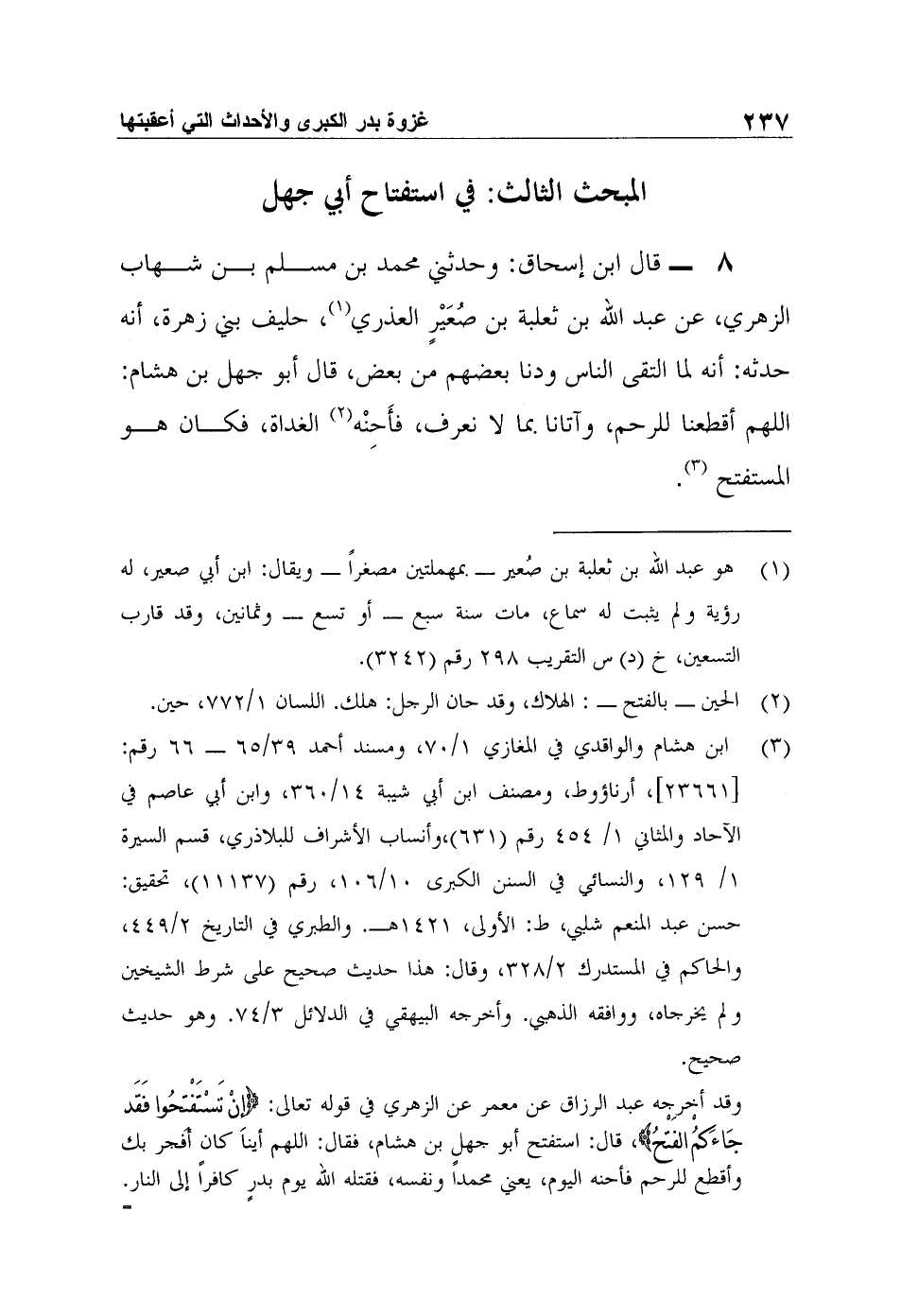 8 - قال ابن إسحاق: وحدثني محمد بن مسلم بن شهاب الزهري، عن عبد الله بن ثعلبة بن صُعَيْرٍ العذري1 حليف بني زهرة، أنه حدثه: أنه لما التقى الناس ودنا بعضهم من بعض، قال أبو جهل بن هشام: "اللهم أقطعنا للرحم، وآتانا بما لا نعرف، فأَحِنْه2 الغداة، فكان هو المستفتح"3.