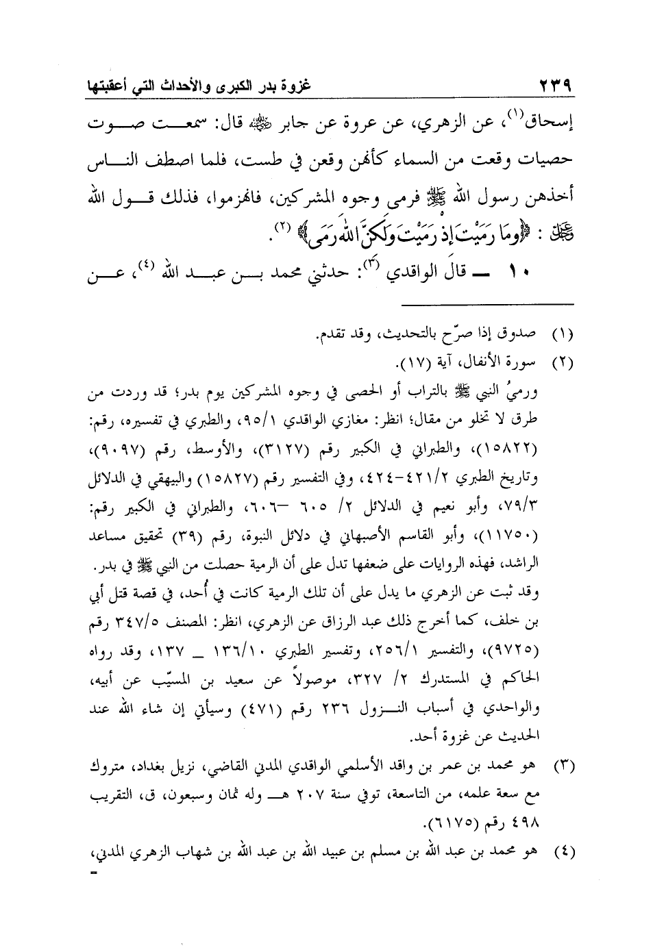 3 هو محمد بن عمر بن واقد الأسلمي الواقدي المدني القاضي، نزيل بغداد، متروك مع سعة علمه، من التاسعة، توفي سنة 207 هـ وله ثمان وسبعون، ق، التقريب 498 رقم (6175) .