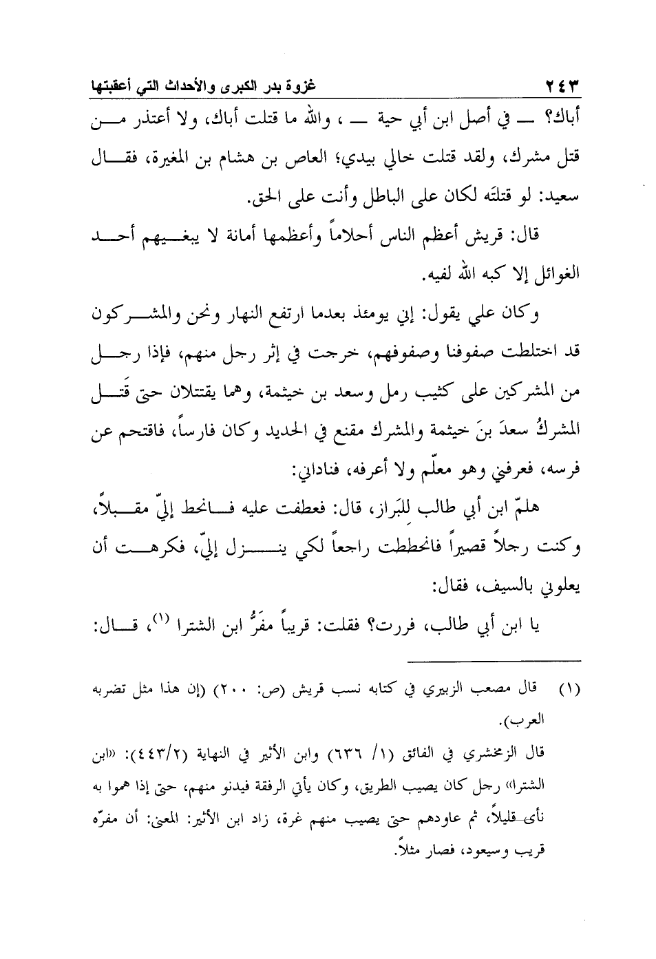 أباك؟ - في أصل ابن أبي حية -، والله ما قتلت أباك، ولا أعتذر من قتل مشرك، ولقد قتلت خالي بيدي؛ العاص بن هشام بن المغيرة، فقال سعيد: لو قتلتَه لكان على الباطل وأنت على الحق.