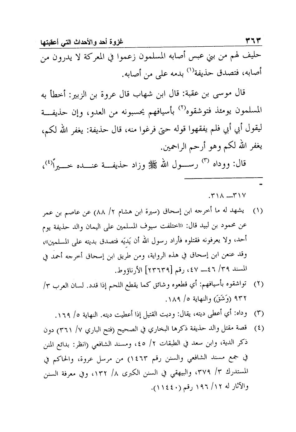 قال موسى بن عقبة: قال ابن شهاب قال عروة بن الزبير: أخطأ به المسلمون يومئذ فتوشقوه2 بأسيافهم يحسبونه من العدو، وإن حذيفة ليقول أبي أبي فلم يفقهوا قوله حتى فرغوا منه، قال حذيفة: يغفر الله لكم، يغفر الله لكم وهو أرحم الراحمين.