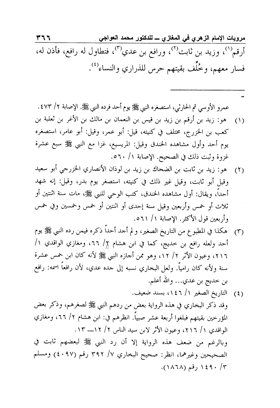 3 هكذا في المطبوع من التاريخ الصغير، ولم أجد أحداً ذكره فيمن رده النبي صلى الله عليه وسلم يوم أحد ولعله رافع بن خديج، كما في ابن هشام 2/ 66، ومغازي الواقدي 1/ 216، وعيون الأثر 2/ 12، وهو ممن أجازه النبي صلى الله عليه وسلم لأنه كان ابن خمس عشرة سنة ولأنه كان رامياً. ولعل البخاري نسبه إلى جده عدي، لأن رافعاً اسمه: رافع بن خديج بن عدي ... والله أعلم.