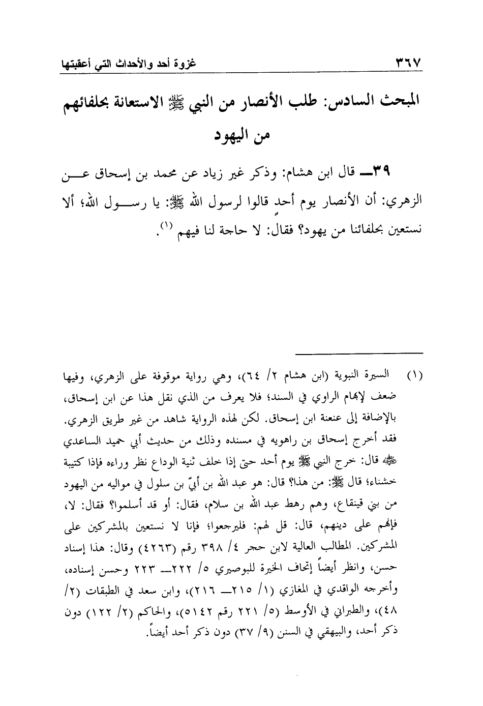 39- قال ابن هشام: وذكر غير زياد عن محمد بن إسحاق عن الزهري: أن الأنصار يوم أحدٍ قالوا لرسول الله صلى الله عليه وسلم: يا رسول الله؛ ألا نستعين بحلفائنا من يهود؟ فقال: "لا حاجة لنا فيهم"1.