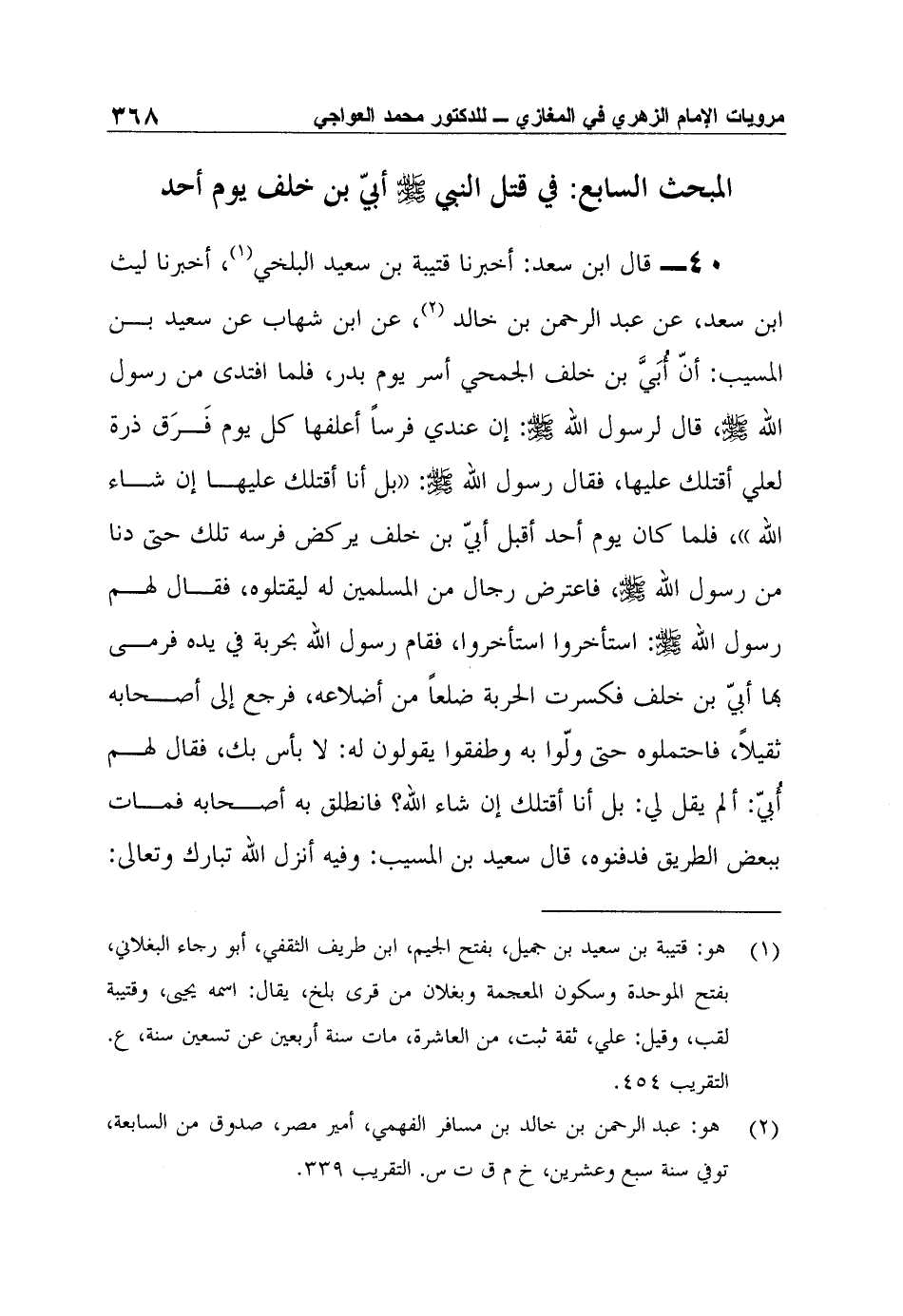 المبحث السابع: في قتل النبي صلى الله عليه وسلم أبيّ بن خلف يوم أحد