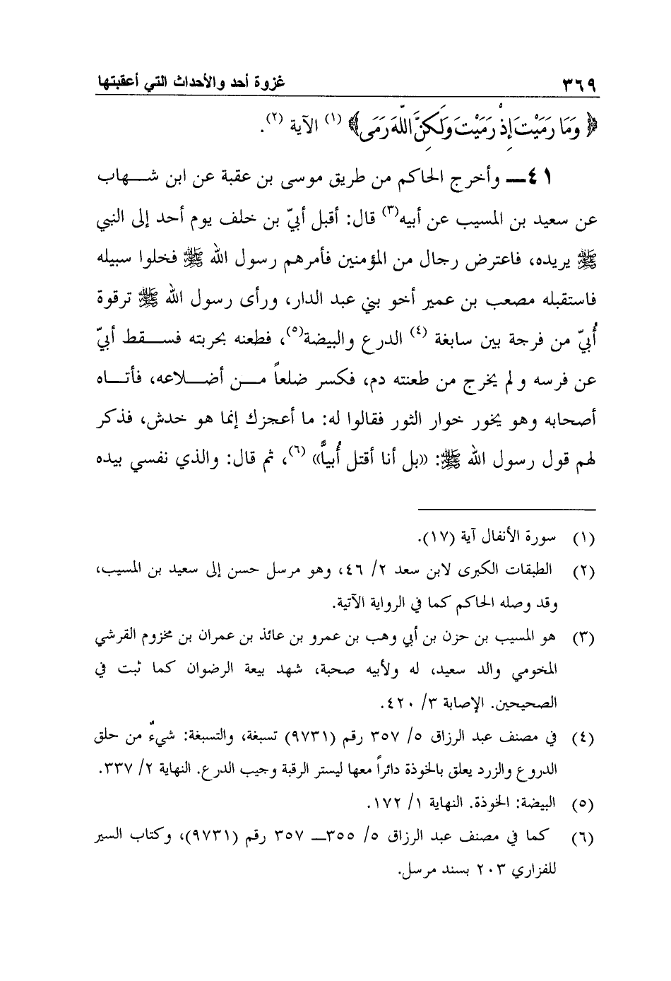 41- وأخرج الحاكم من طريق موسى بن عقبة عن ابن شهاب عن سعيد بن المسيب عن أبيه3 قال: أقبل أبيّ بن خلف يوم أحد إلى النبي صلى الله عليه وسلم يريده، فاعترض رجال من المؤمنين فأمرهم رسول الله صلى الله عليه وسلم فخلوا سبيله فاستقبله مصعب بن عمير أخو بني عبد الدار، ورأى رسول الله صلى الله عليه وسلم ترقوة أُبيّ من فرجة بين سابغة4 الدرع والبيضة5، فطعنه بحربته فسقط أبيّ عن فرسه ولم يخرج من طعنته دم، فكسر ضلعاً من أضلاعه، فأتاه أصحابه وهو يخور خوار الثور فقالوا له: ما أعجزك إنما هو خدش، فذكر لهم قول رسول الله صلى الله عليه وسلم: (بل أنا أقتل أُبياًّ) 6، ثم قال: والذي نفسي بيده