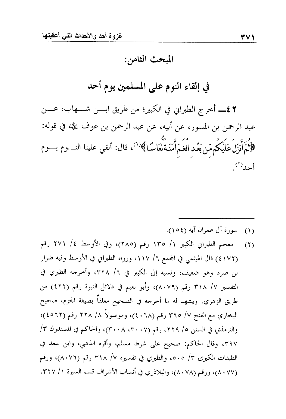 42- أخرج الطبراني في الكبير؛ من طريق ابن شهاب، عن عبد الرحمن بن المسور، عن أبيه، عن عبد الرحمن بن عوف رضي الله عنه في قوله: {ثُمَّ أَنزَلَ عَلَيْكُم مِّن بَعْدِ الْغَمِّ أَمَنَةً نُّعَاسًا} 1، قال: ألقي علينا النوم يوم أحد2.