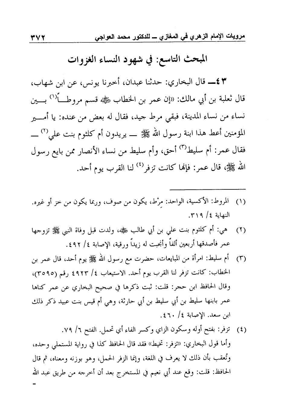 43- قال البخاري: حدثنا عبدان، أخبرنا يونس، عن ابن شهاب، قال ثعلبة بن أبي مالك: (إن عمر بن الخطاب رضي الله عنه قسم مروطاً1 بين نساء من نساء المدينة، فبقي مرط جيد، فقال له بعض من عنده: يا أمير المؤمنين أعط هذا ابنة رسول الله صلى الله عليه وسلم - يريدون أم كلثوم بنت علي2 - فقال عمر: أم سليط3 أحق، وأم سليط من نساء الأنصار ممن بايع رسول الله صلى الله عليه وسلم، قال عمر: فإنها كانت تزفر4 لنا القرب يوم أحد.